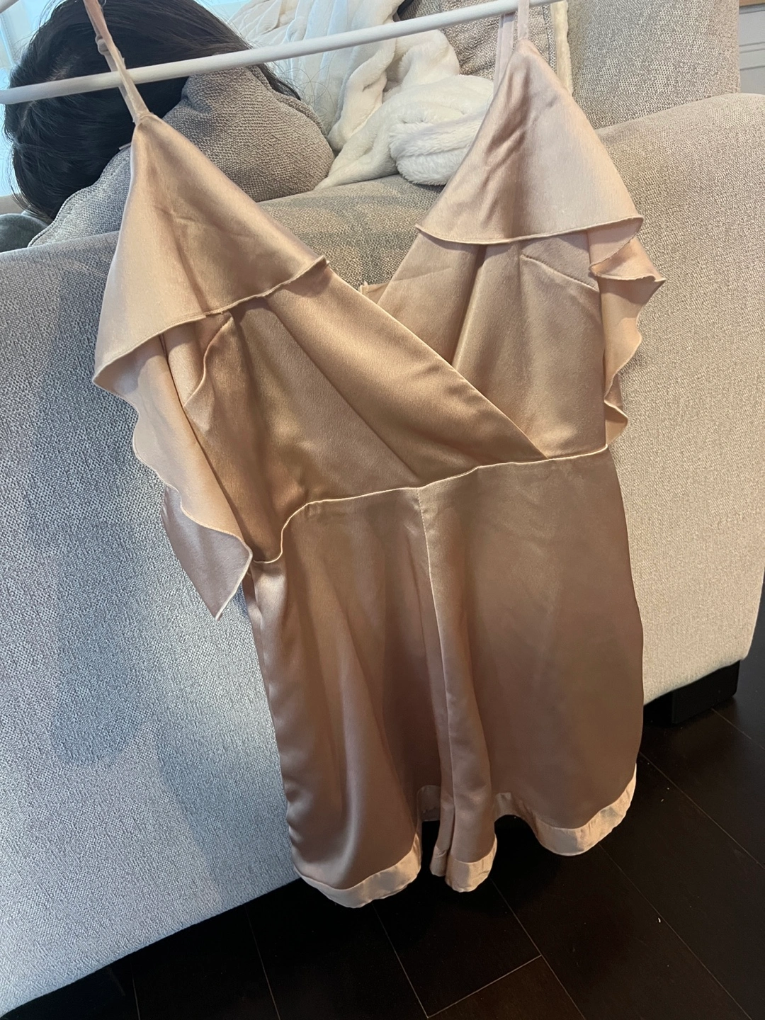 Size 2. Satin jumpsuit with ruffle detailing. Back zipper closure and adjustable straps.