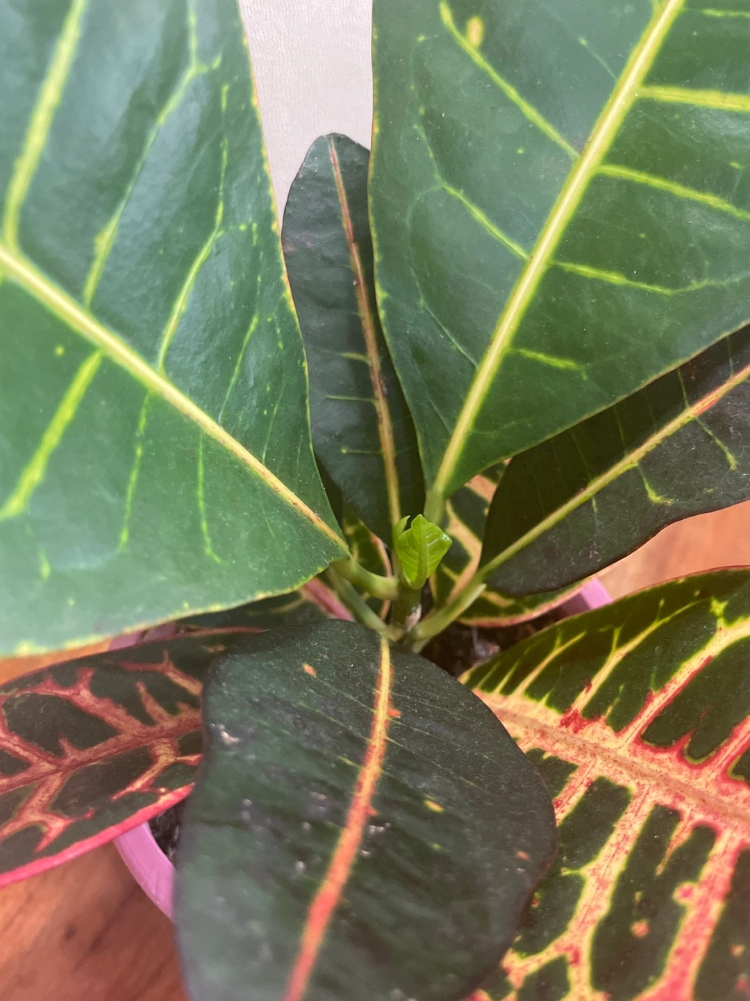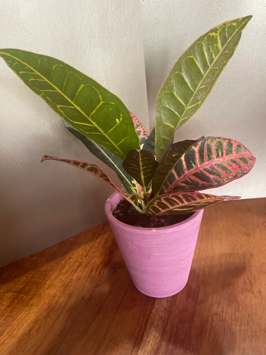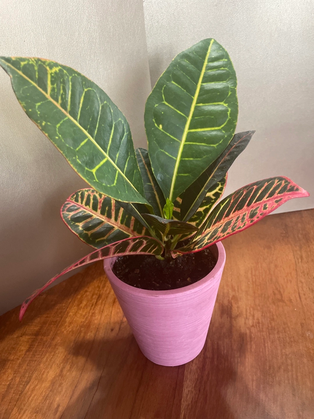 Small Croton plant in a pink pot. Healthy with new growth. Great for a new place ๐ธ