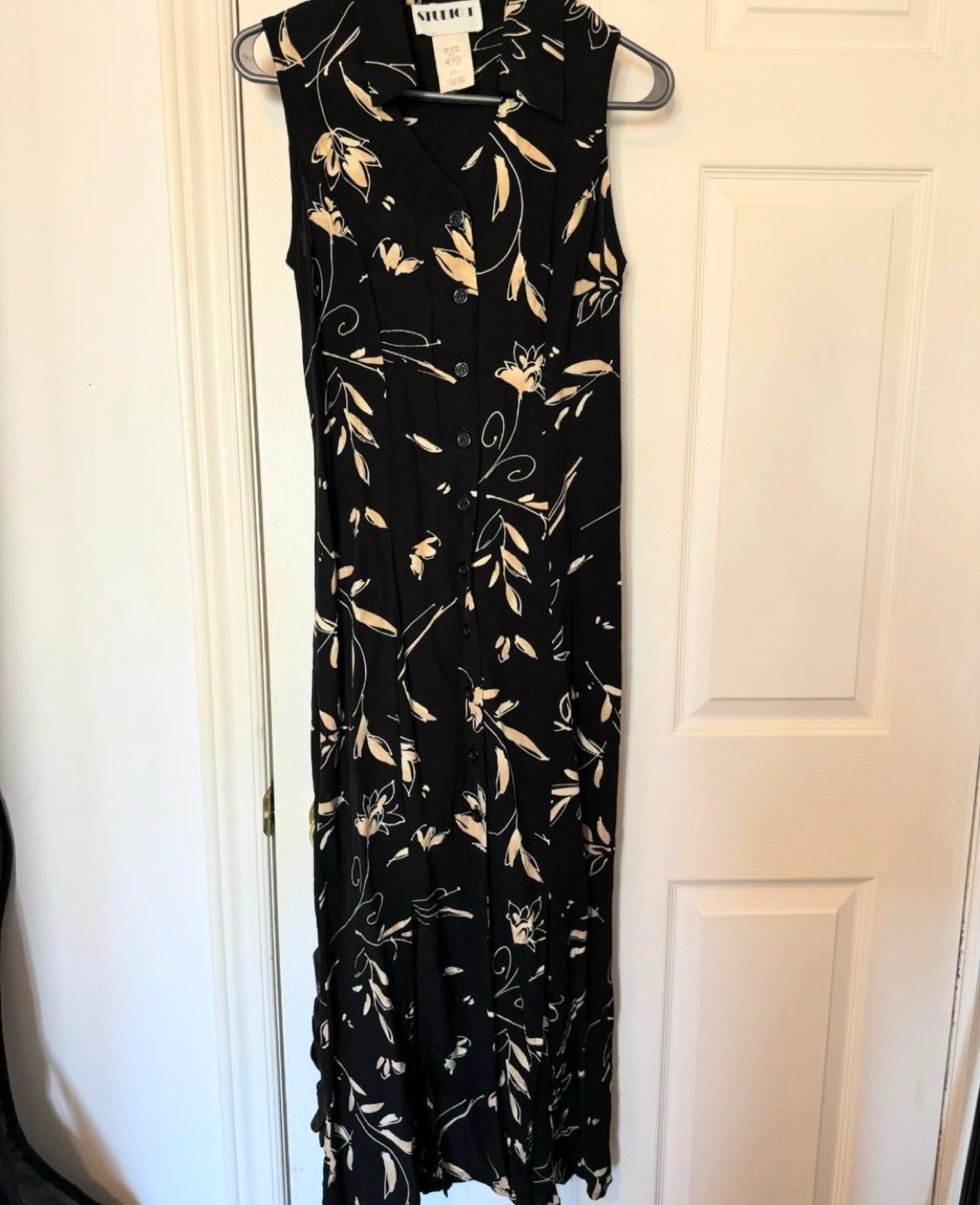 Sleeveless maxi dress with a floral pattern, button closure, and a collared neckline.
