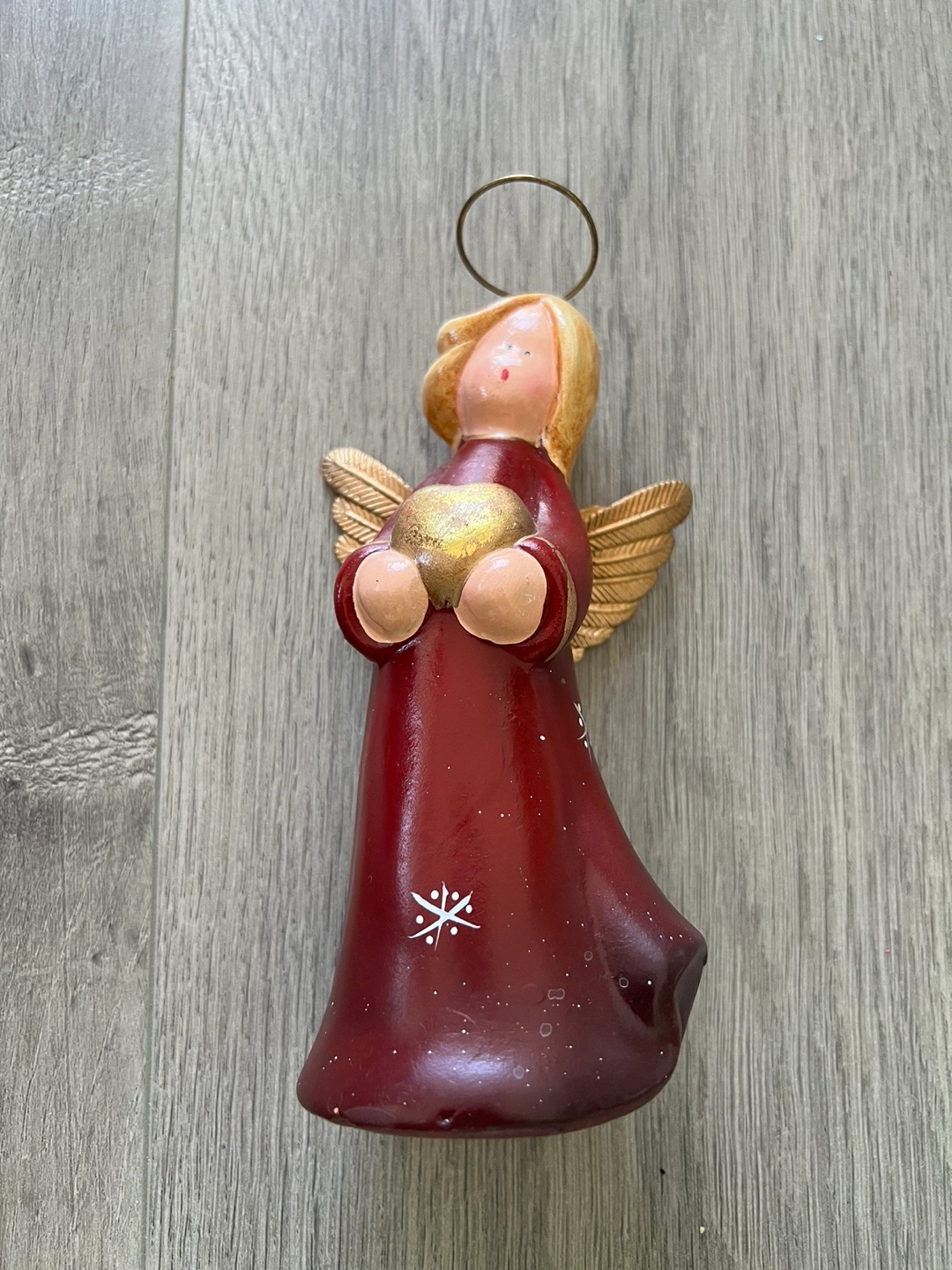 Red and gold ceramic angel figurine with a halo. Holds a heart in her hands.
