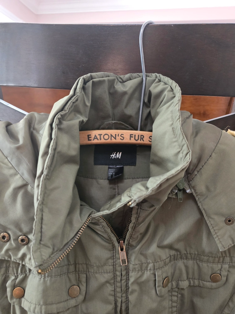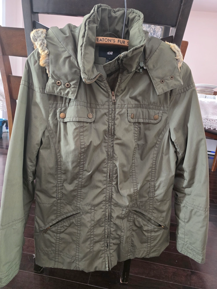 Green winter jacket with an imitation of faux fur hood. Zipper closure, multiple pockets, and a cinched waist. We can meet at a Plaza or at the subway station.