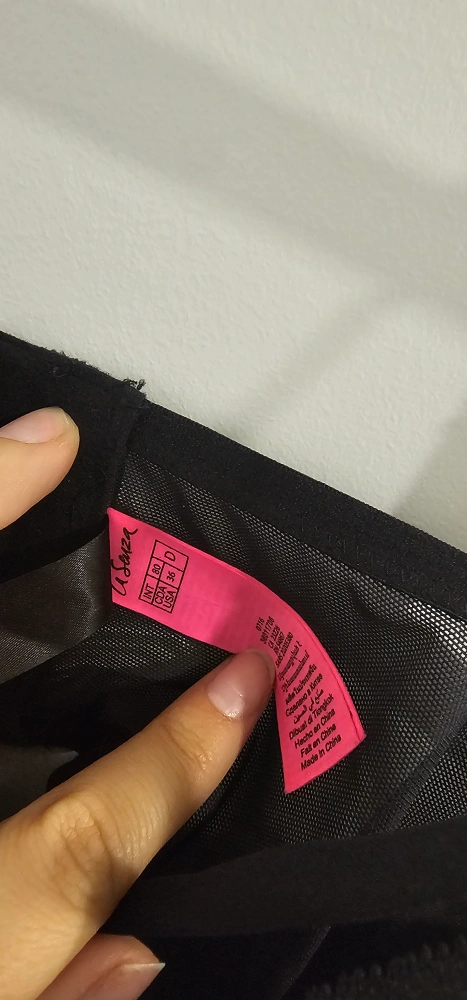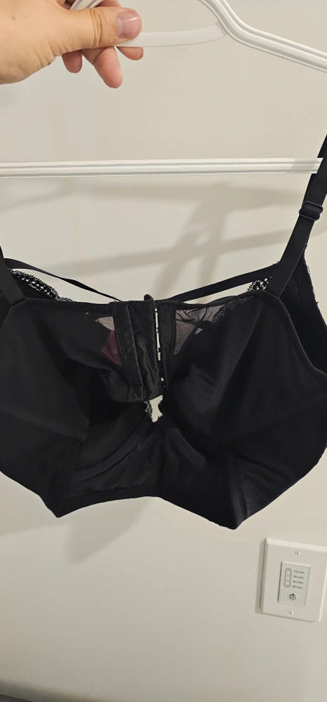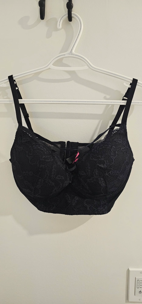 Black lace bustier / bra with adjustable straps and a hook and eye closure.