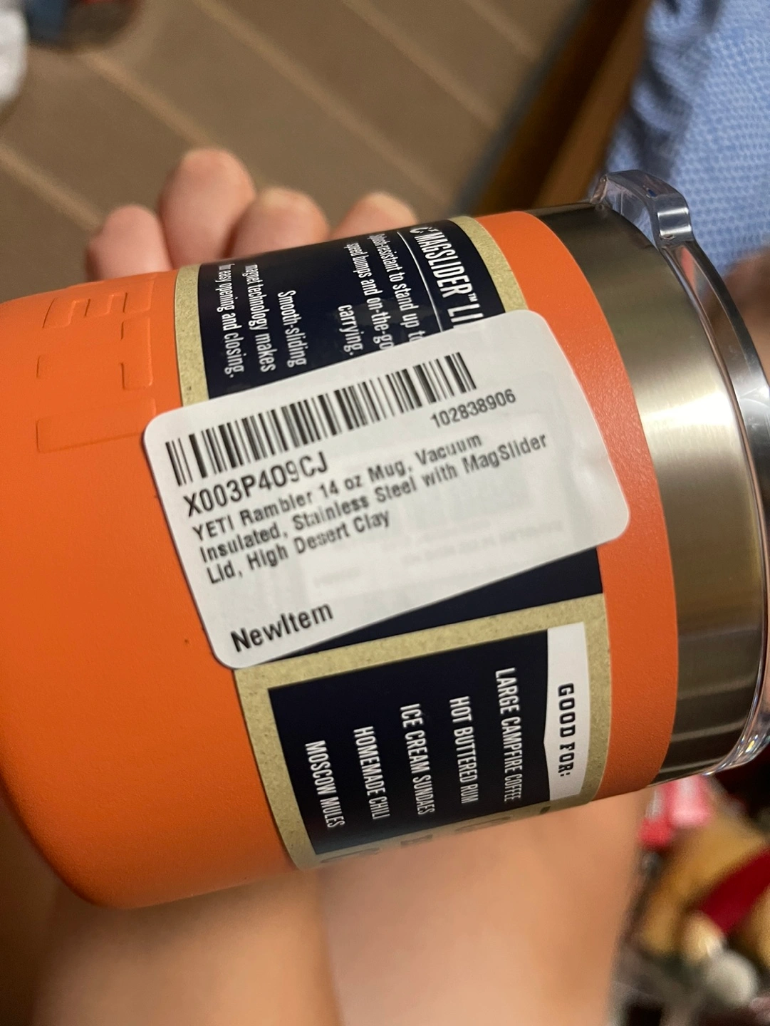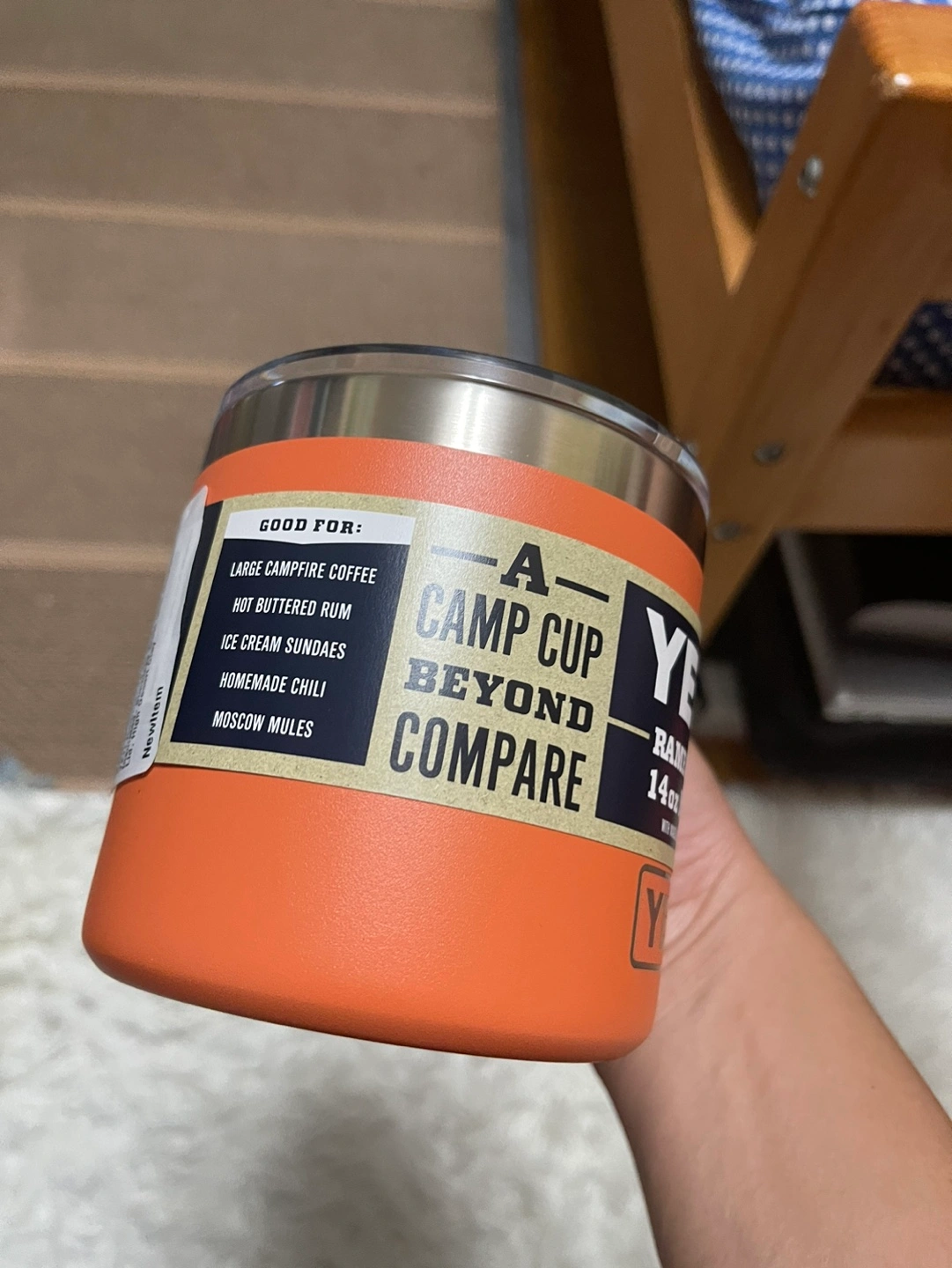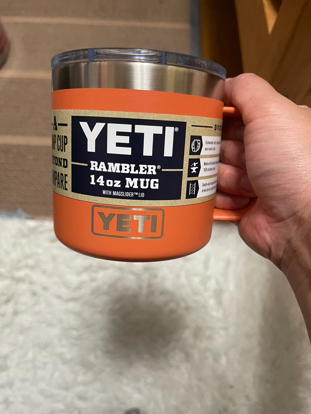 Orange YETI Rambler 14 oz mug with MagSlider lid. Vacuum insulated, stainless steel. Brand new. Never used. Pick up Dundas and Spadina.
