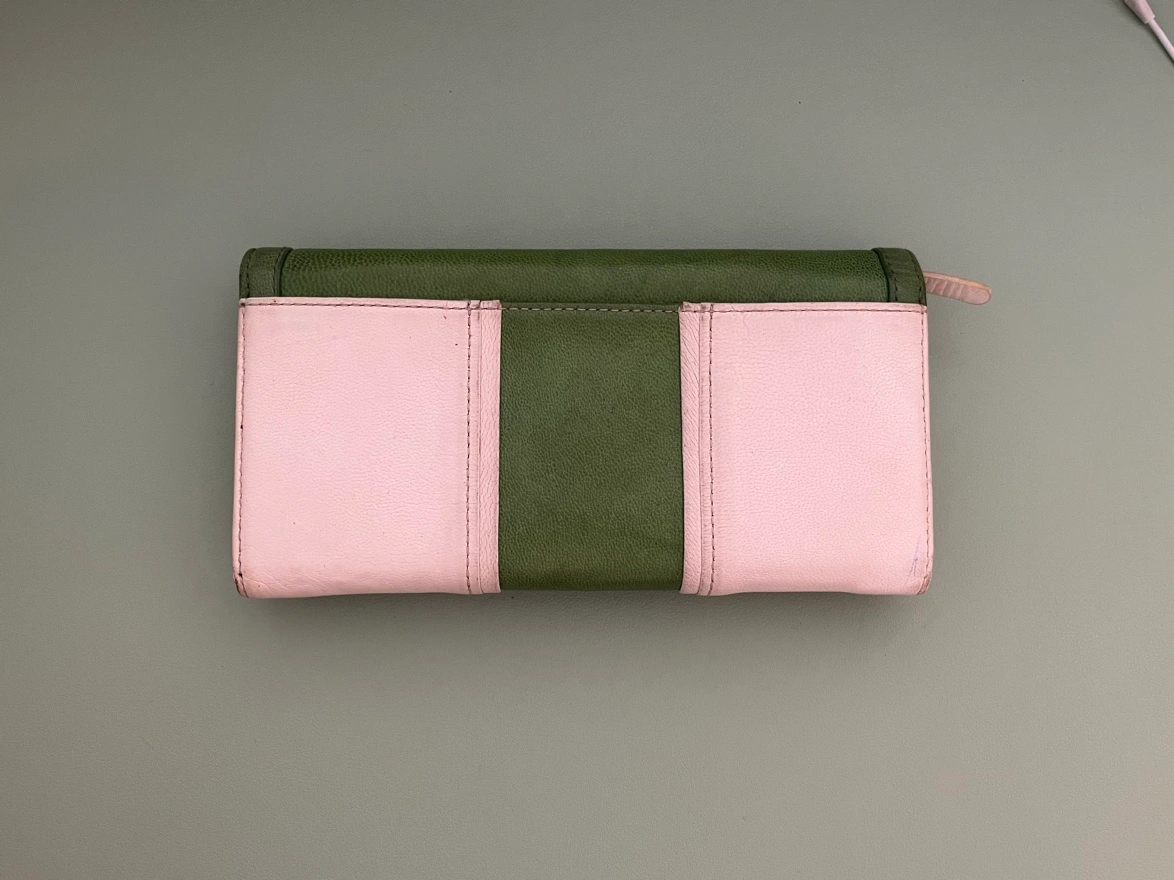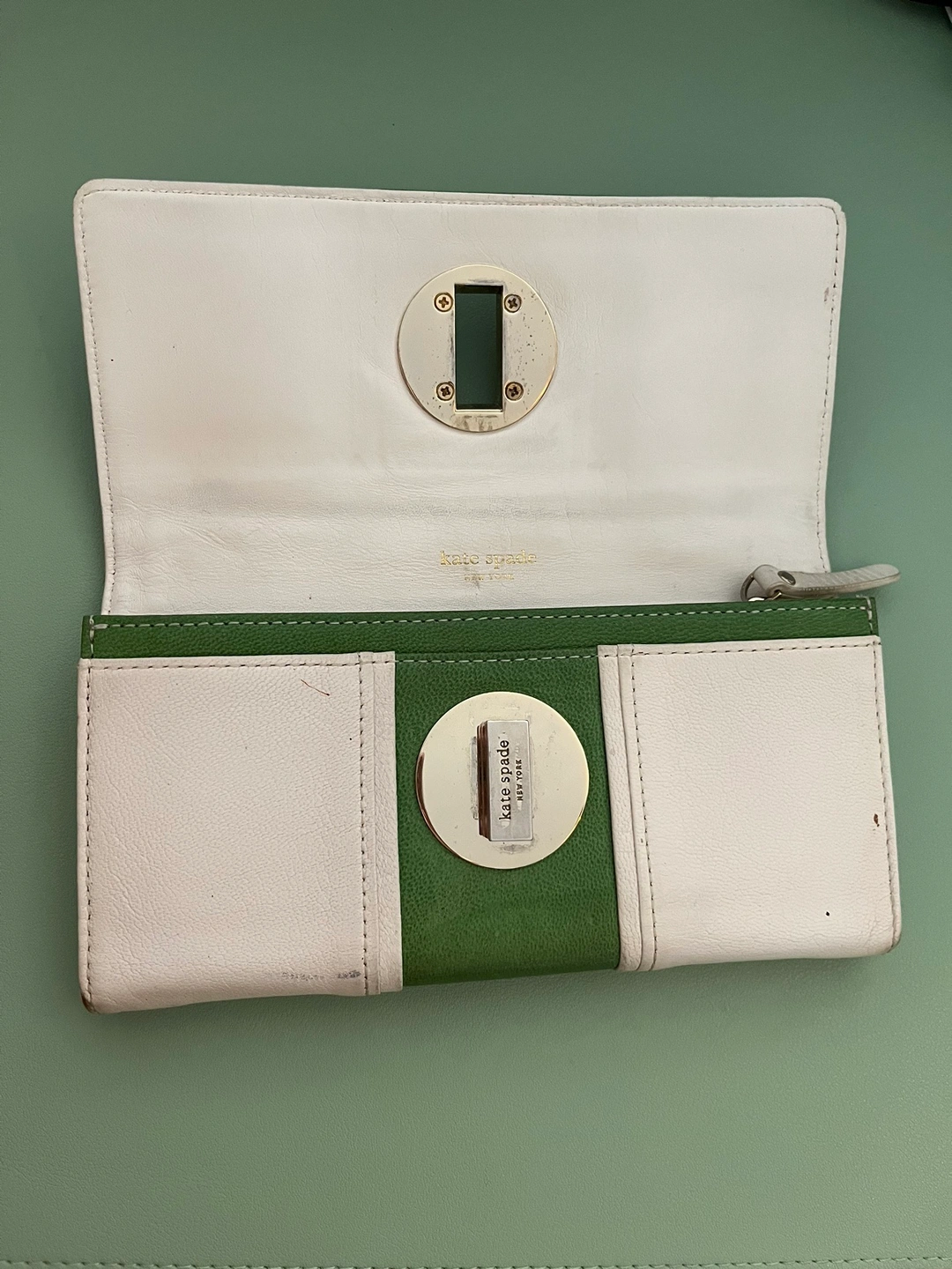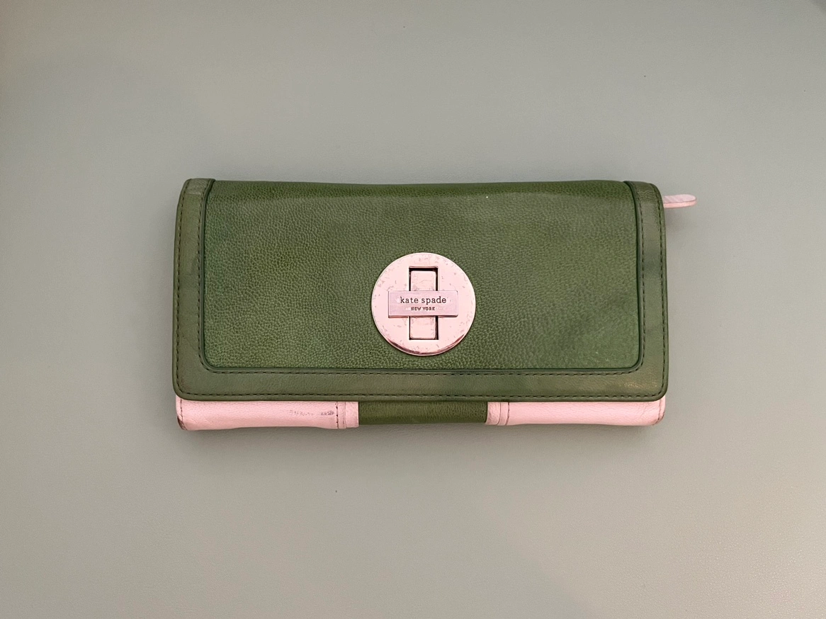 Kate Spade wallet with 5 slip pockets, 8 card slots, and a zippered pocket. 5 slip pockets - 4 internal, 1 external. For context, my iPhone 13 with case on is able to fit in every pocket. Functional buckle closure and zipper. I believe it is leather but cannot confirm. It is a soft and slightly bendable material.