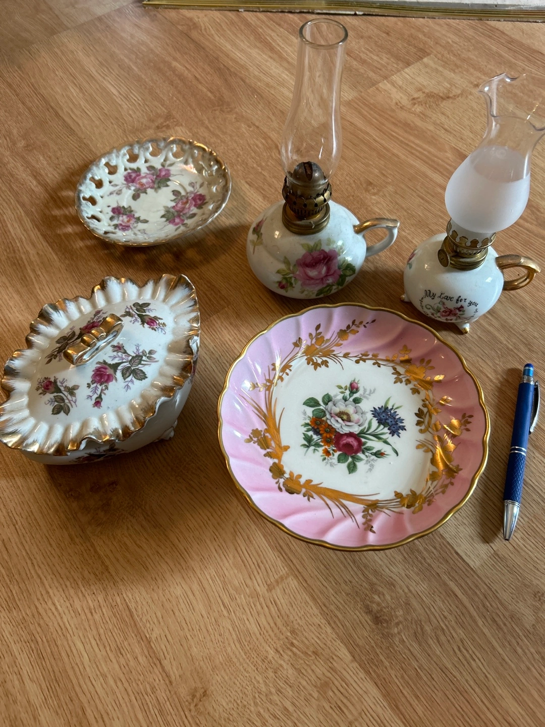 Set of five vintage porcelain items. Two oil lamps, one small plate, and one lidded dish. All items have gold accents and floral designs.start from 15 for all or 4$ each