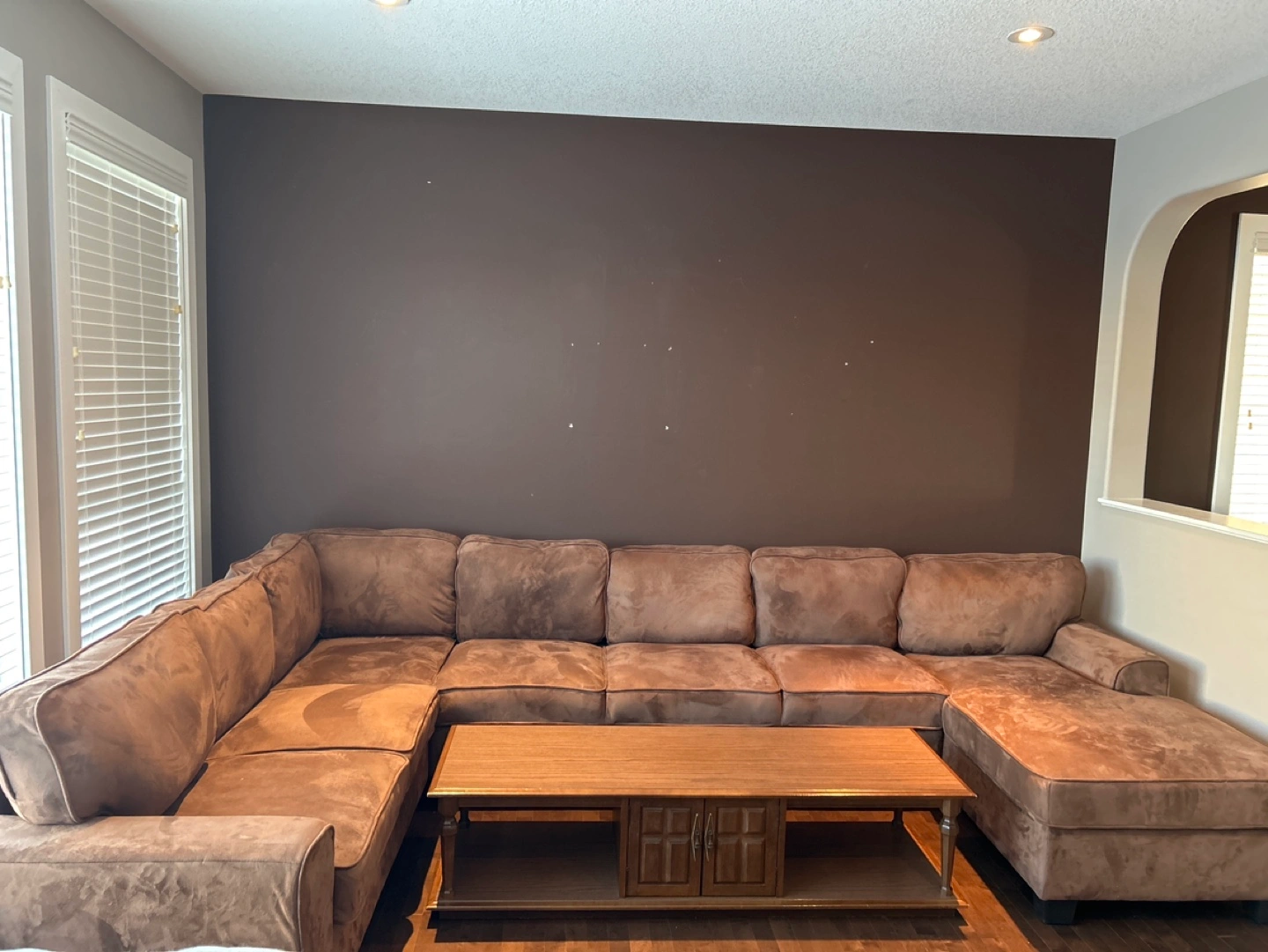 Brown sectional sofa with a chaise lounge. Includes a matching coffee table.