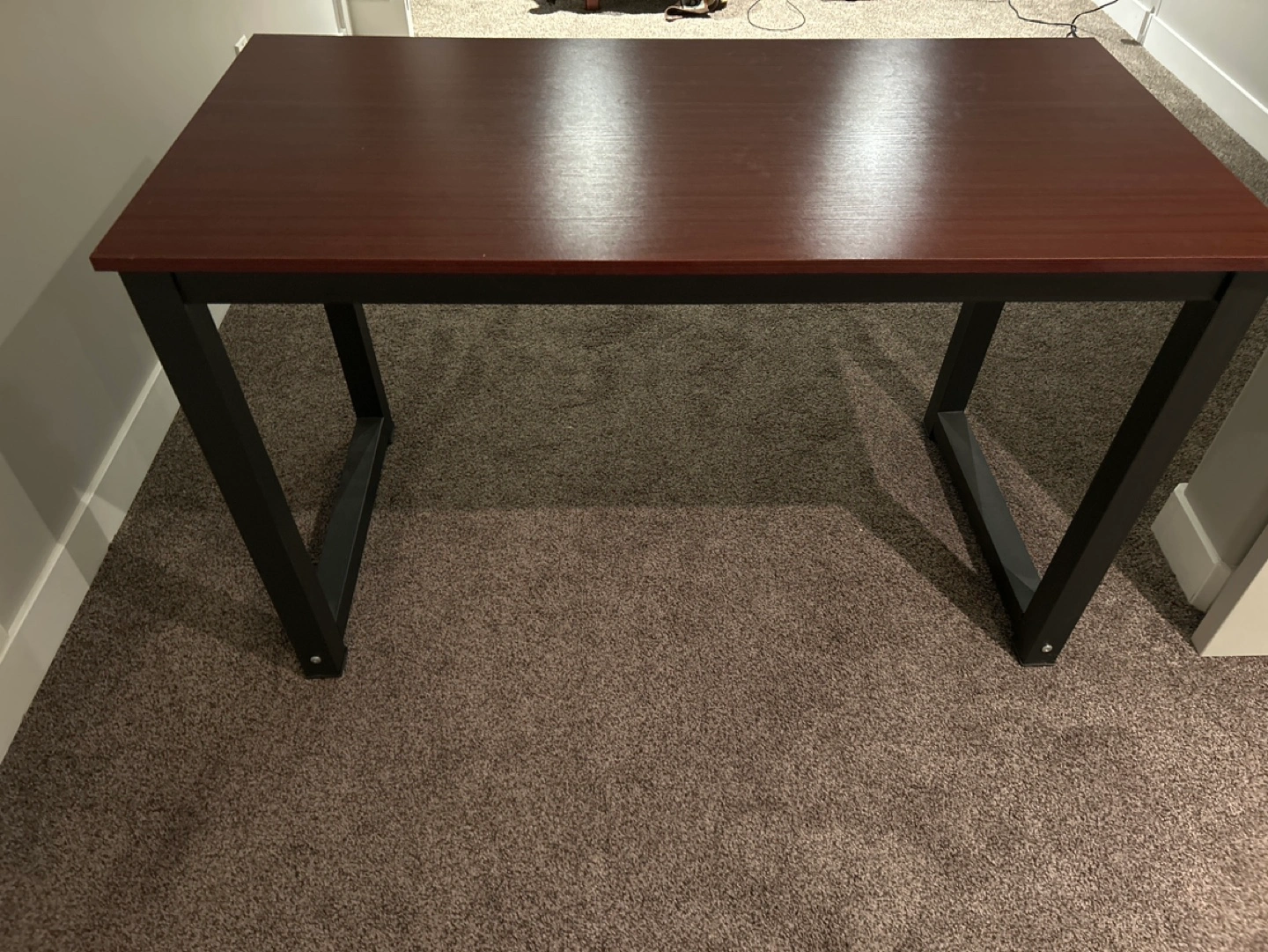 Office desk with black metal frame and brown wood top.