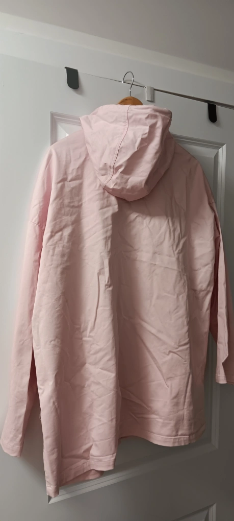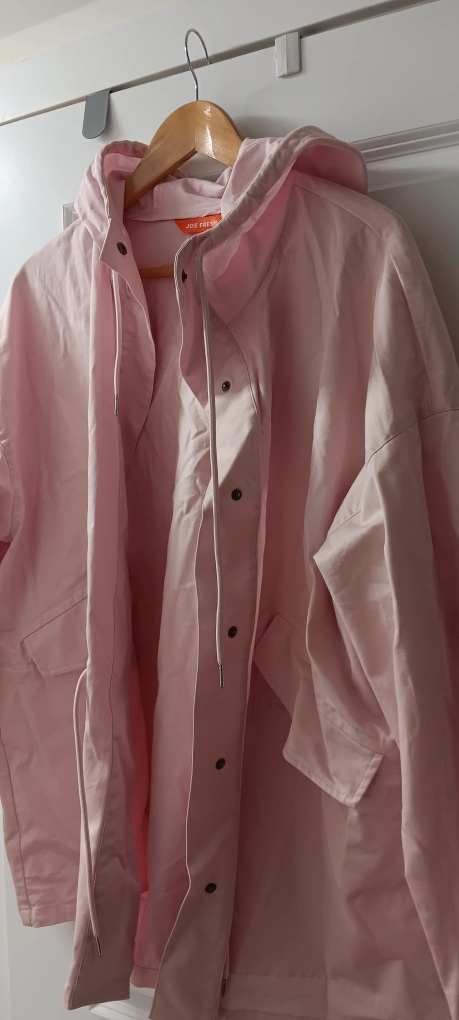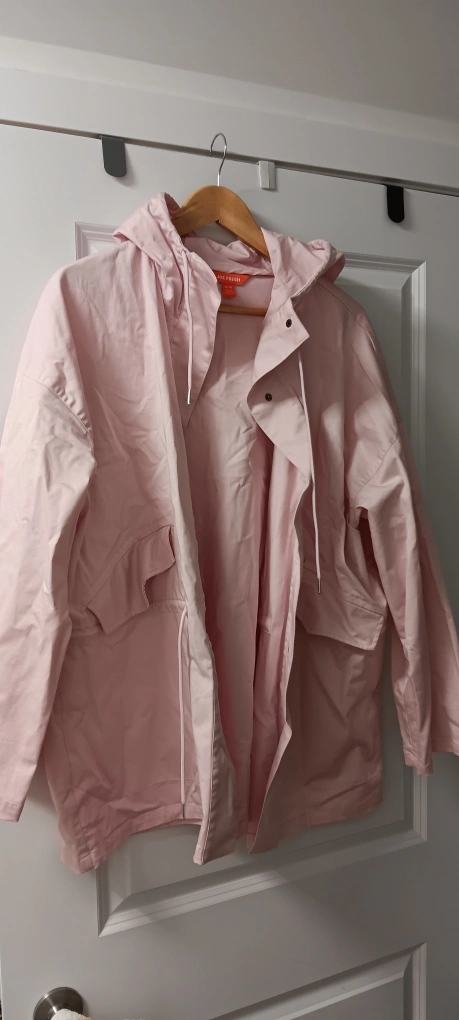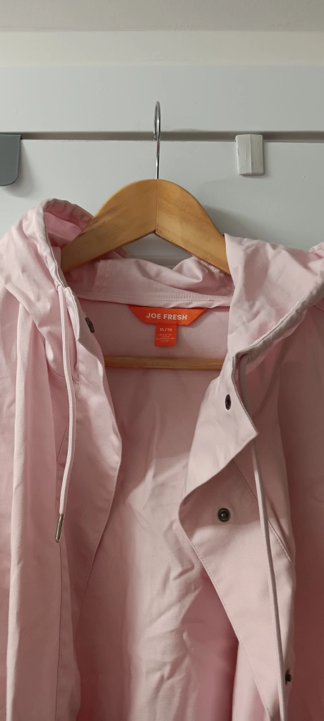 Light pink jacket with a hood. Has a button closure, two pockets on the front