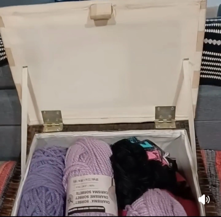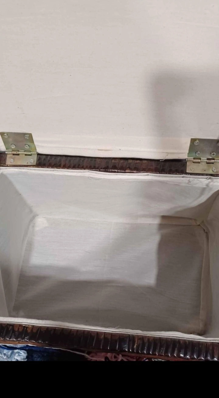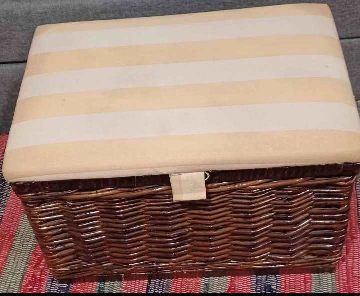 Wicker storage ottoman with a hinged lid and a fabric top. Has a removable liner for easy cleaning. Dimension 10x10.5x15.5' I'm using it like store my yarn It's also footstool Yarn are not included. It has some stains on the fabric It's strong .