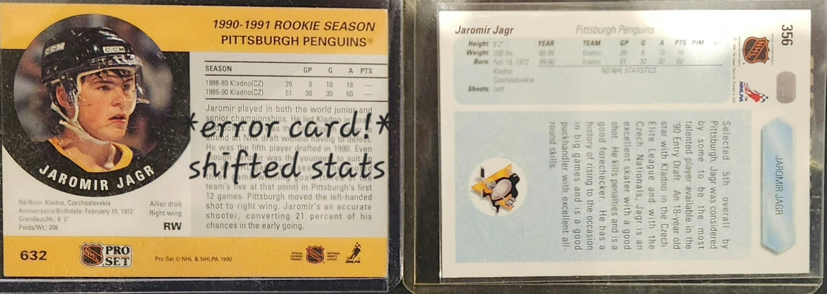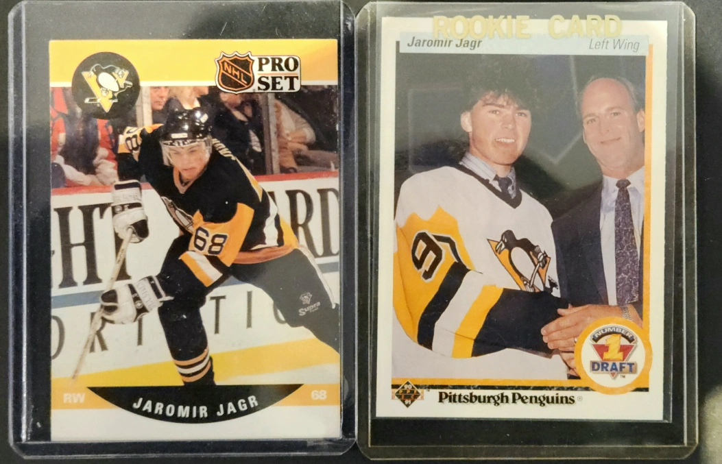 Hi there! - yes, the items pictured are 100% available, no need to ask, only to message to pick up - located at M8V 1G5 & I will provide the full address if you are interested in picking up. Not offering shipping. Kindly asking for cash upon purchase. Price is firm however, I am offering bundle deals and discounts If you're looking to purchase other items from my listings. Please see below - please be kind and respectful :) Pair of Jagr rookie cards - Pittsburgh Penguins Pro set card (left) has shifted stats, an error. 30 year old cards - conditioned as such, great/excellent condition of each. Check out my listings for more Collectibles, Comics, Cards, Sports Memorabilia, Funko Pops and SODA, and much more. No trades. Thank you for taking the time to read the description.