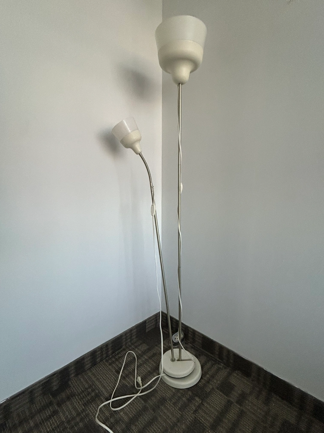Floor lamp with two lights. White shades, silver stand. Good condition. Light bulbs included Convenient lamps provides a warm light used for an office space. The smaller lamp can be adjusted to pointing any direction.