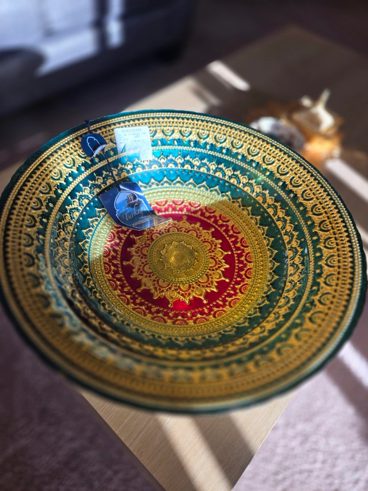 Glass bowl with gold accents. It has a pedestal base and intricate designs. This exquisite piece is imported directly from Turkey. Absolutely gorgeous, brand new with tags. Please message if interested, thank you.
