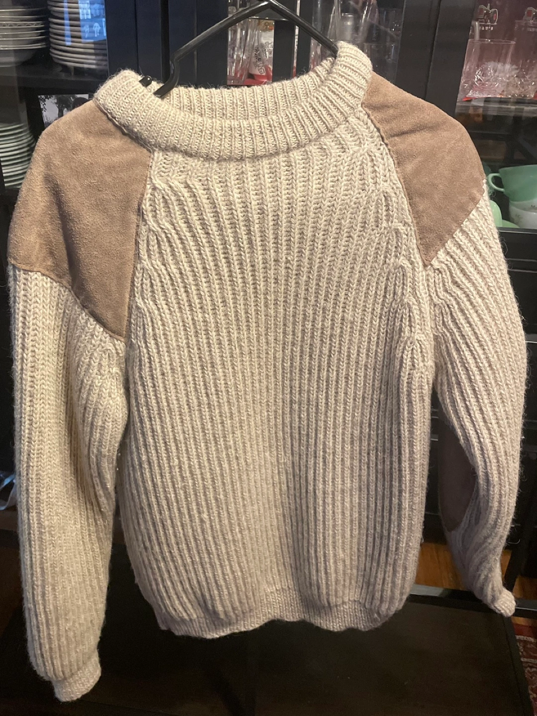 Cream coloured pure wool sweater with suede elbow patches and shoulder pads. Made in Scotland. Purchased in the UK. I loved it but not my style anymore.