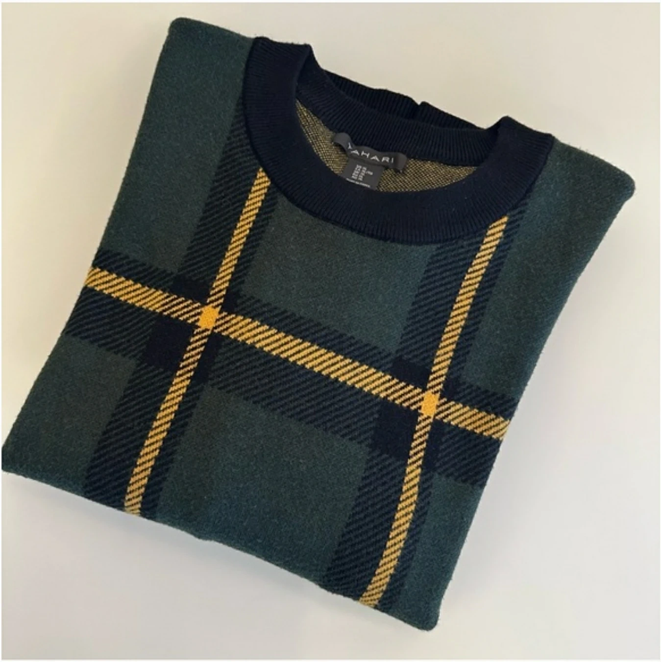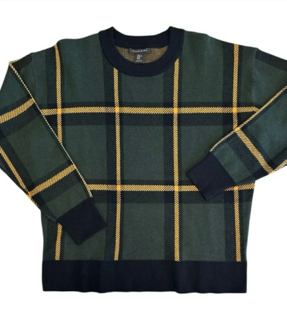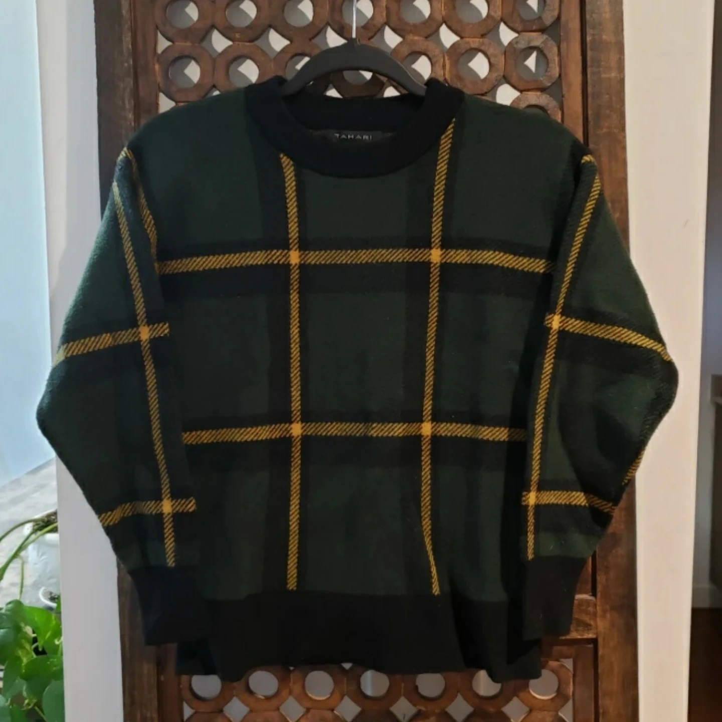 Green and yellow plaid sweater. Long sleeves, crew neck.