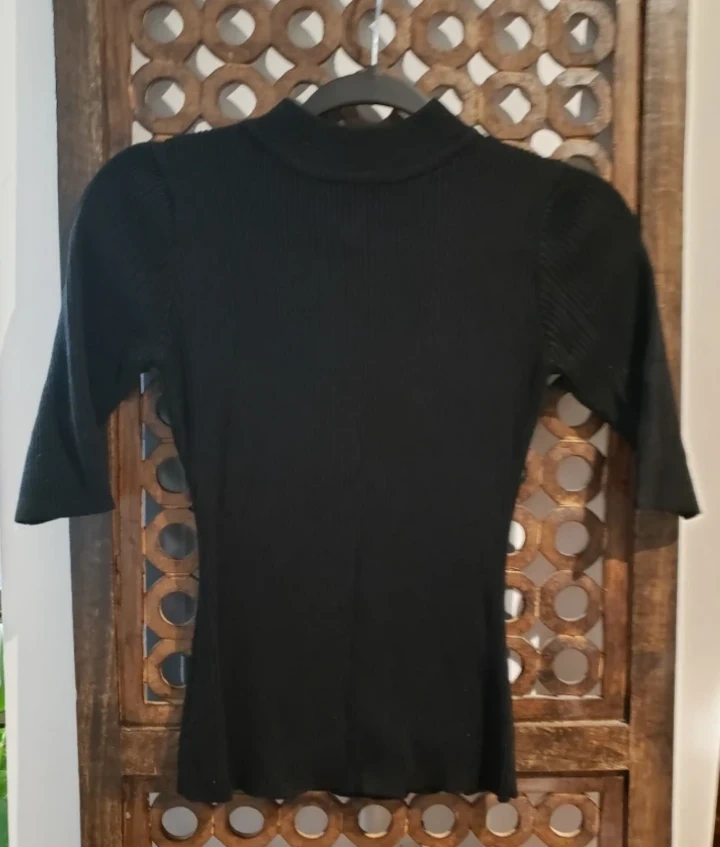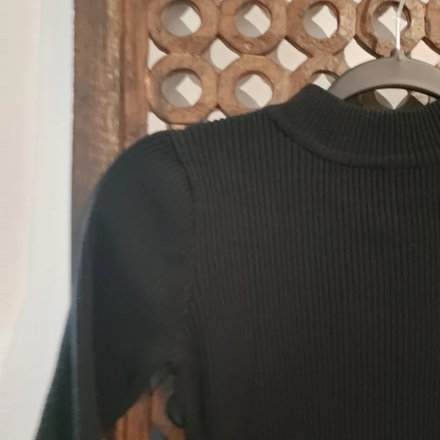 Black, ribbed knit top. Features a mock neck and formed fit.
