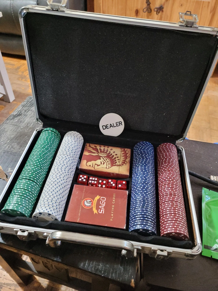 Poker chips, dice, and cards included. Aluminum case included.,cards in sealed wrappers...