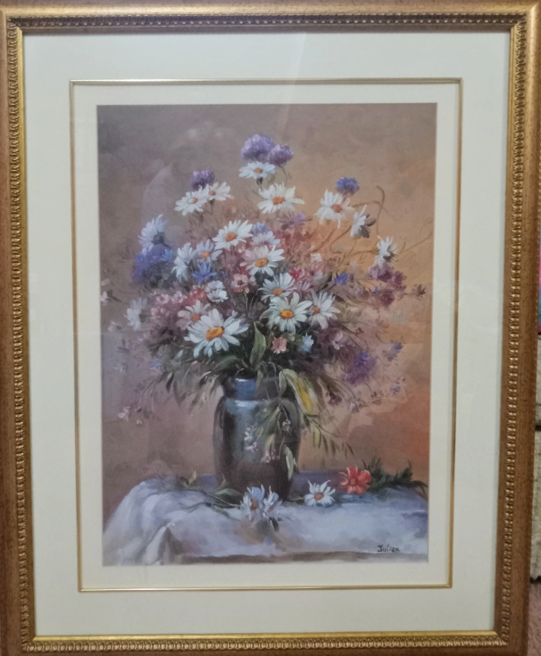Framed print of a floral arrangement, featuring daisies in a vase. Gold frame.