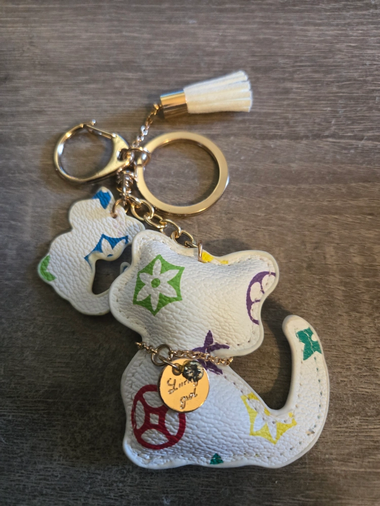 White cat keychain with a gold chain and a small charm that says "Lucky girl".