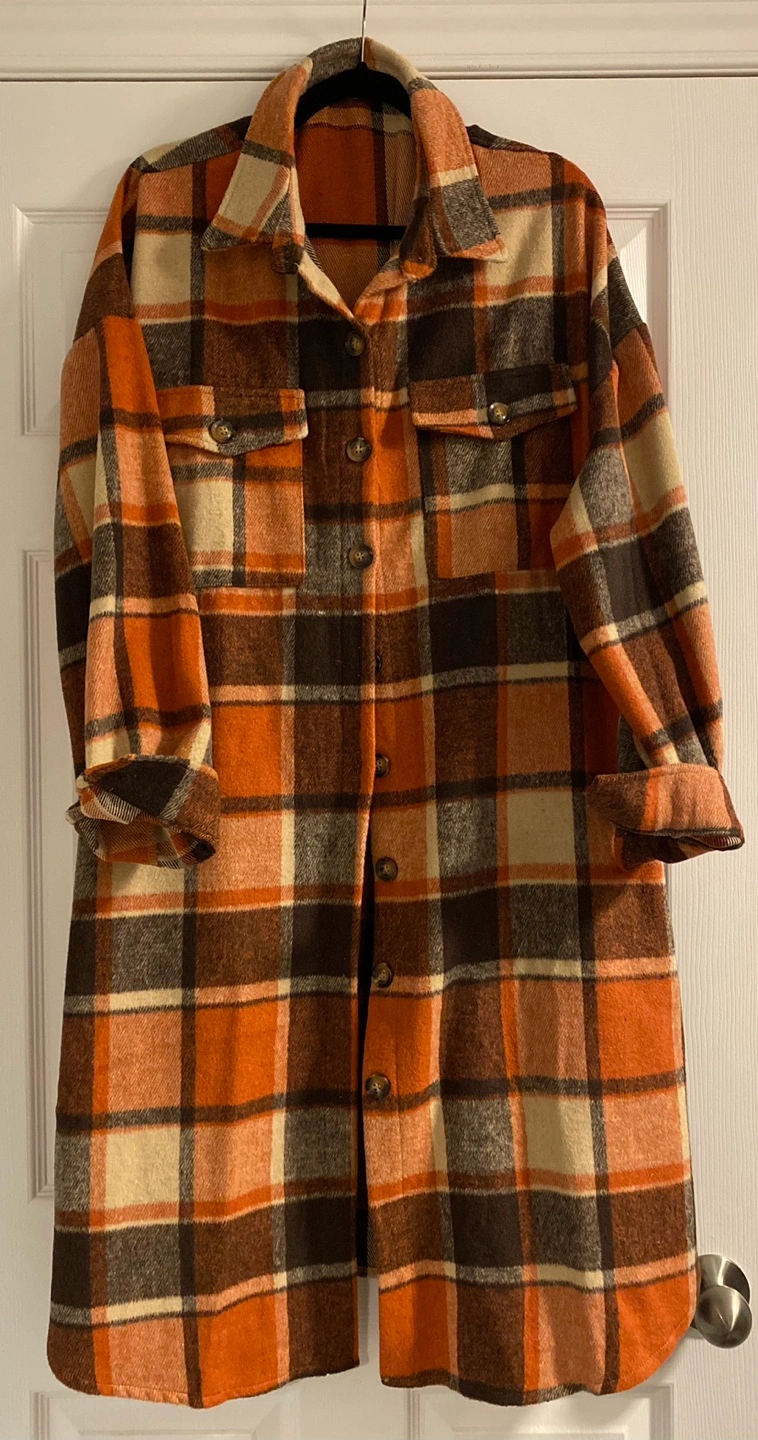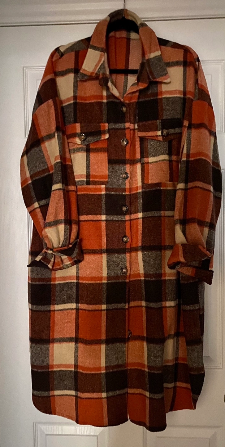Long sleeve, button-up shirt jacket with two front pockets. Plaid pattern in brown, orange, and beige. Size L/Xl Basically new