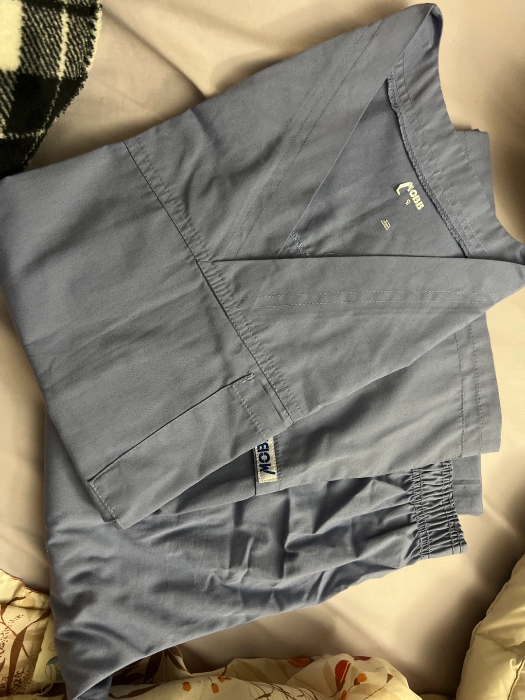Blue scrub top and pants set. V-neck top with pockets. Elastic waistband on pants.