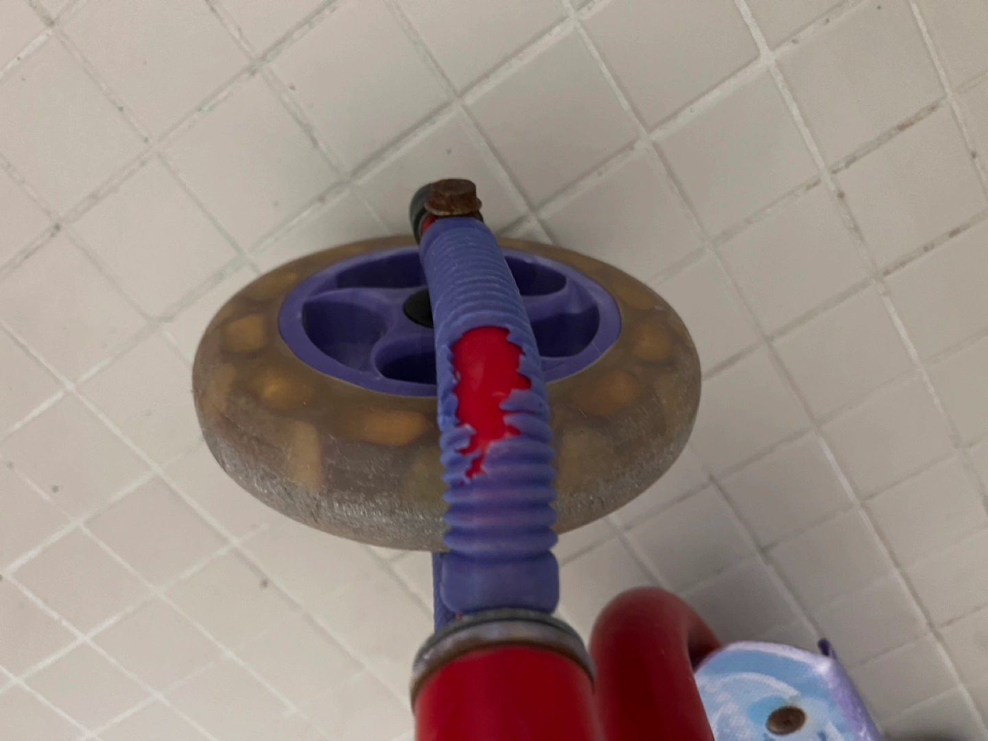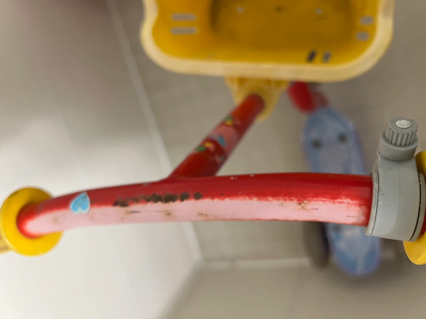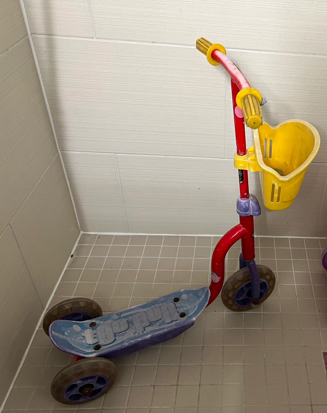 Used kids scooter with a basket. Red frame with yellow and purple accents. Little bit of rust on the handle and the outer covering of one part of the frame is broken but does not impact functionality as it is only the decorative cover. Porch pickup near Donald Cousens Parkway and Highway 7 in east Markham