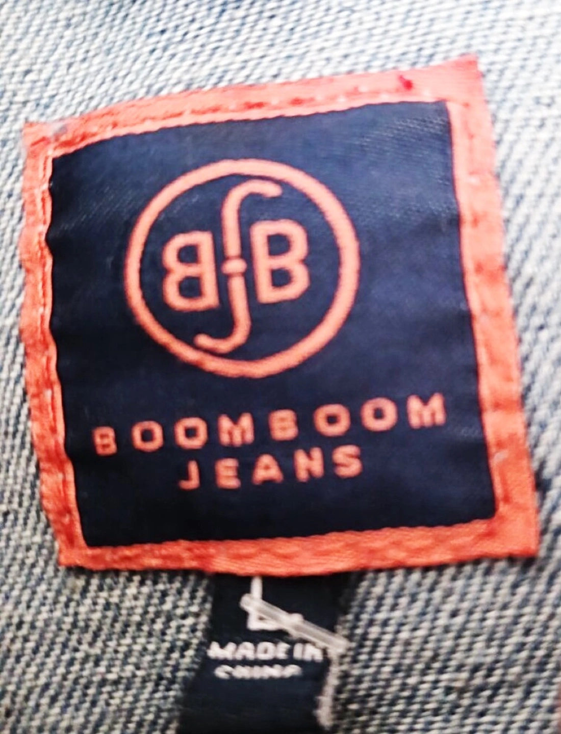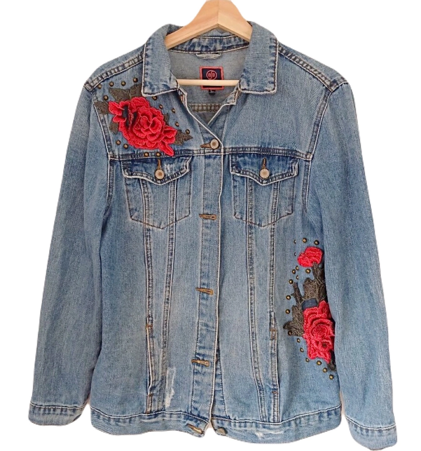 BoomBoom Distressed Blue Jeans Denim Jacket with Red Flowers 🌺 and metal studs. Size Large (pit to pit 20.5”)