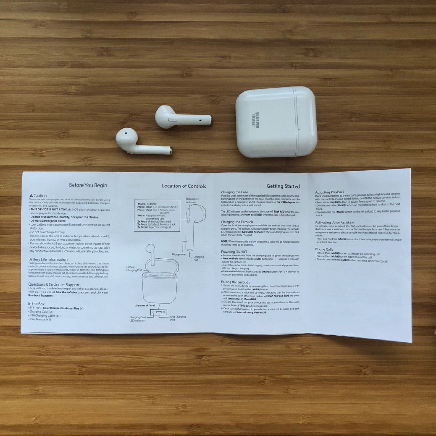 True wireless earbuds with charging case, auto pairing, and built-in microphone. Bluetooth 5.0. Up to 18 hours of playtime. It has a button on each one to pause/play and I think also skip. I’m not an audiophile so the sound quality was comparable to EarPods to me.. the only thing I didn’t like was that the microphone didn’t work great, and I had to hold one earbud up to my mouth when making calls. But these would work if you’re just listening to music. Connecting it the first time might be finicky (follow the instructions exactly and you’ll get it!) but after that it stays connected pretty well. FYI I use an iPhone.