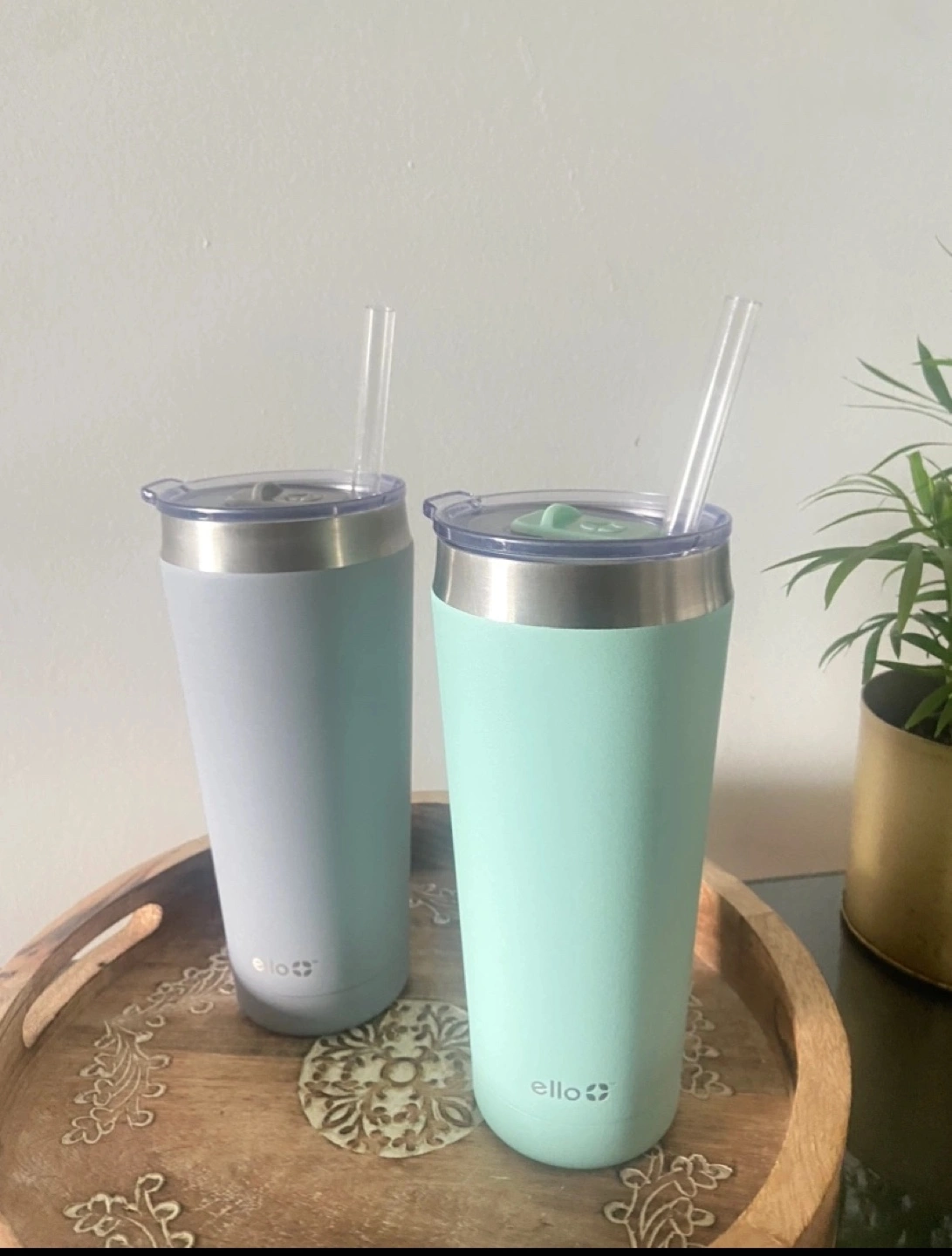 Set of 2 Ello Water Tumblers with straws in Blue and Grey color. 24Oz capacity $10 for both or $5 for each Retails for $18.99+taxes each Pick up in Liberty Village For more details check: https://www.elloproducts.com/collections/tumblers/products/beacon-vacuum-insulated-stainless-tumbler?variant=36375070933144 Set of two reusable tumblers, each with a lid and a straw. One grey and one green.