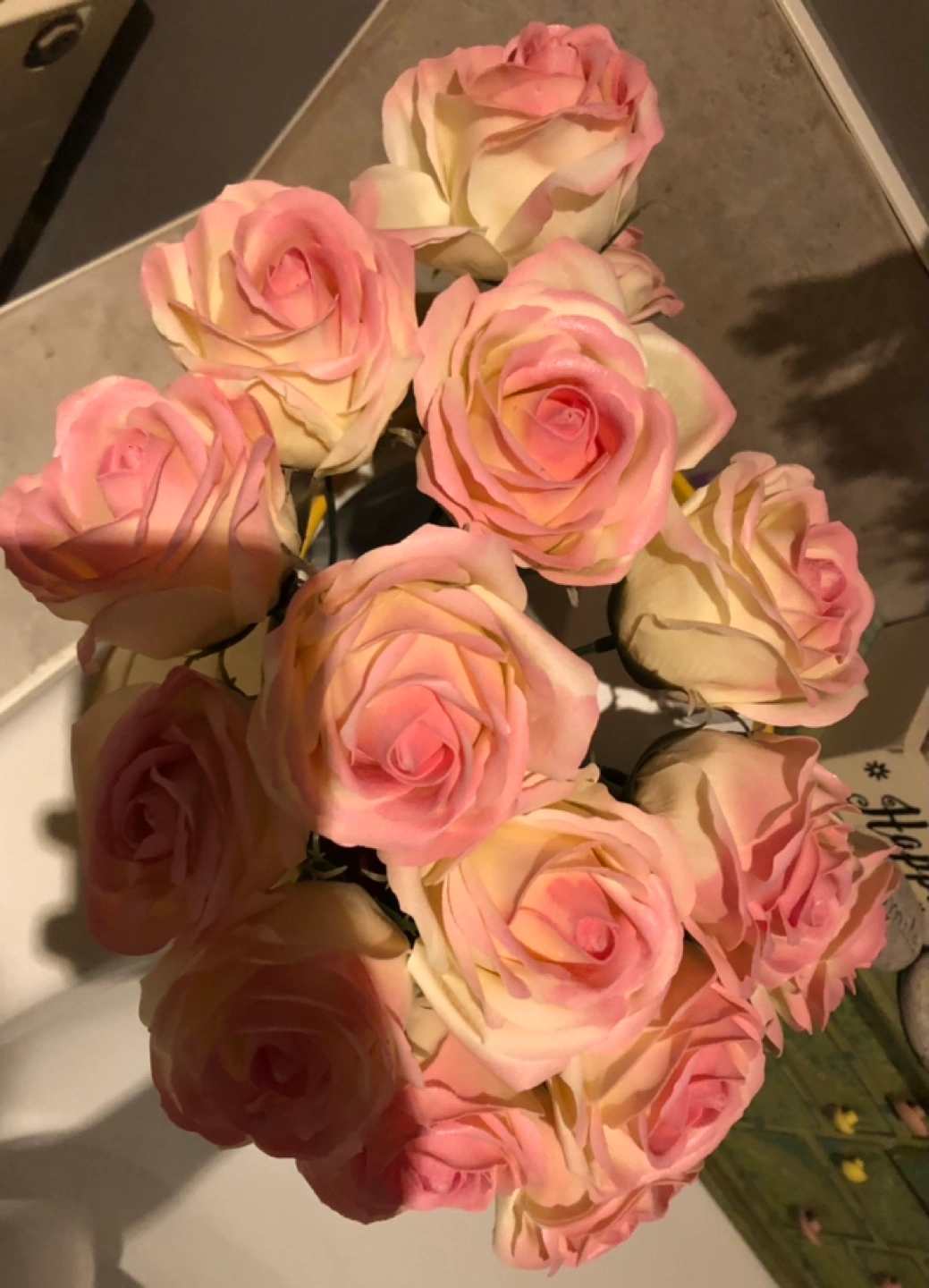 Artificial rose bouquet in a yellow bucket. Roses are a cream colour with pink edges. Pick up @ midtown, cash only🤗