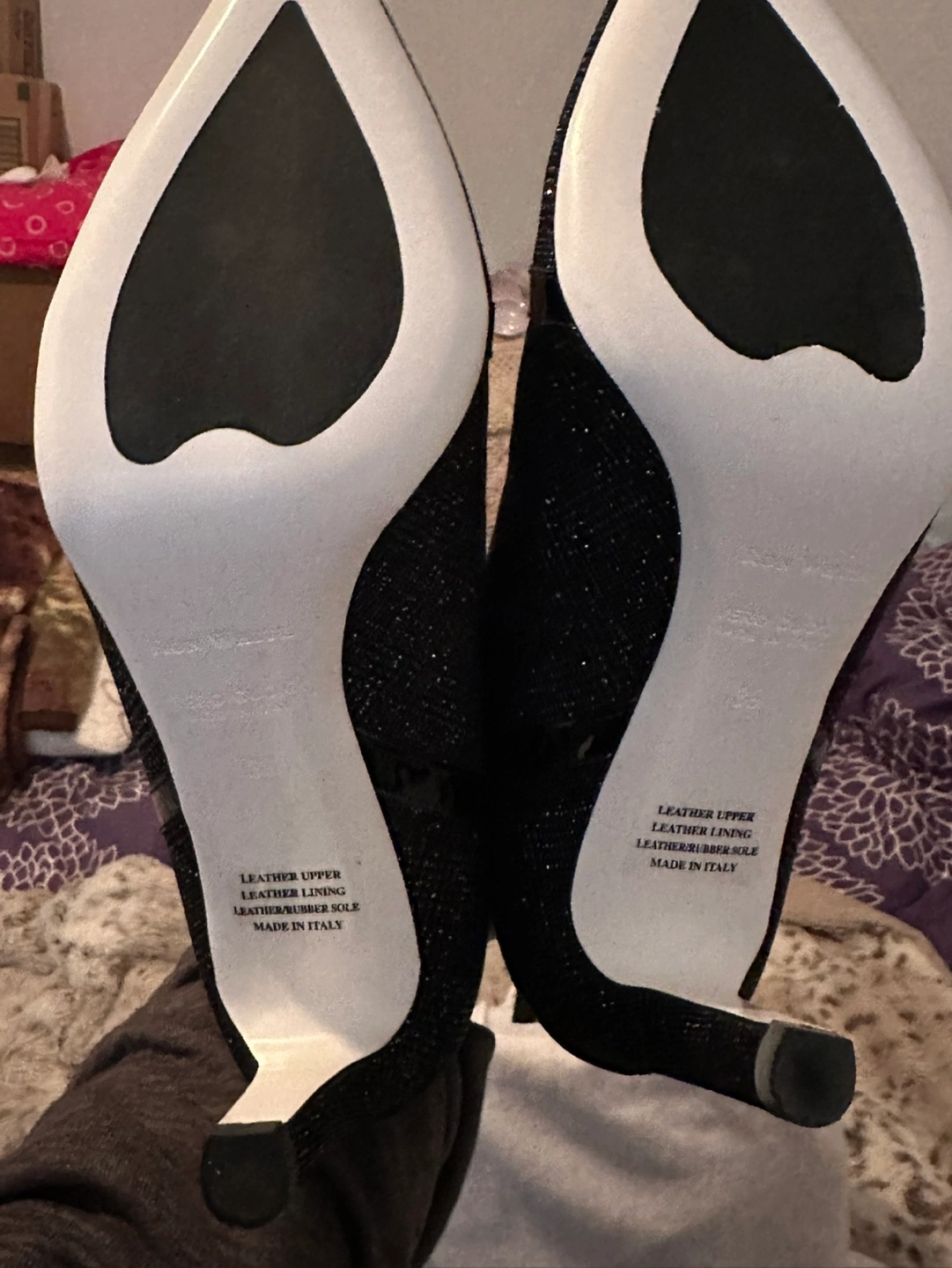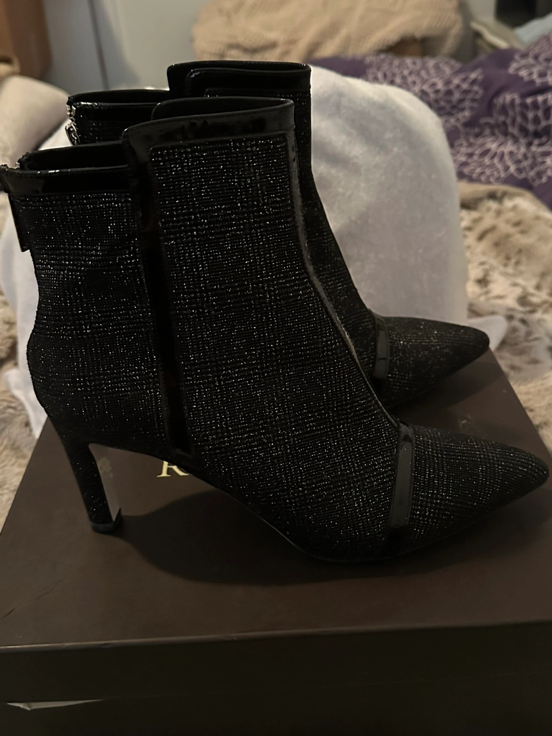 Black sparkly booties with a pointed toe and a stiletto heel. They have a zipper closure and a patent leather accent on the toe and side. Brand new in original box, never worn, smoke free home. Original price with tax $785.35. See photo 7 for purchase receipt. Euro size 39 which is 8.5/9