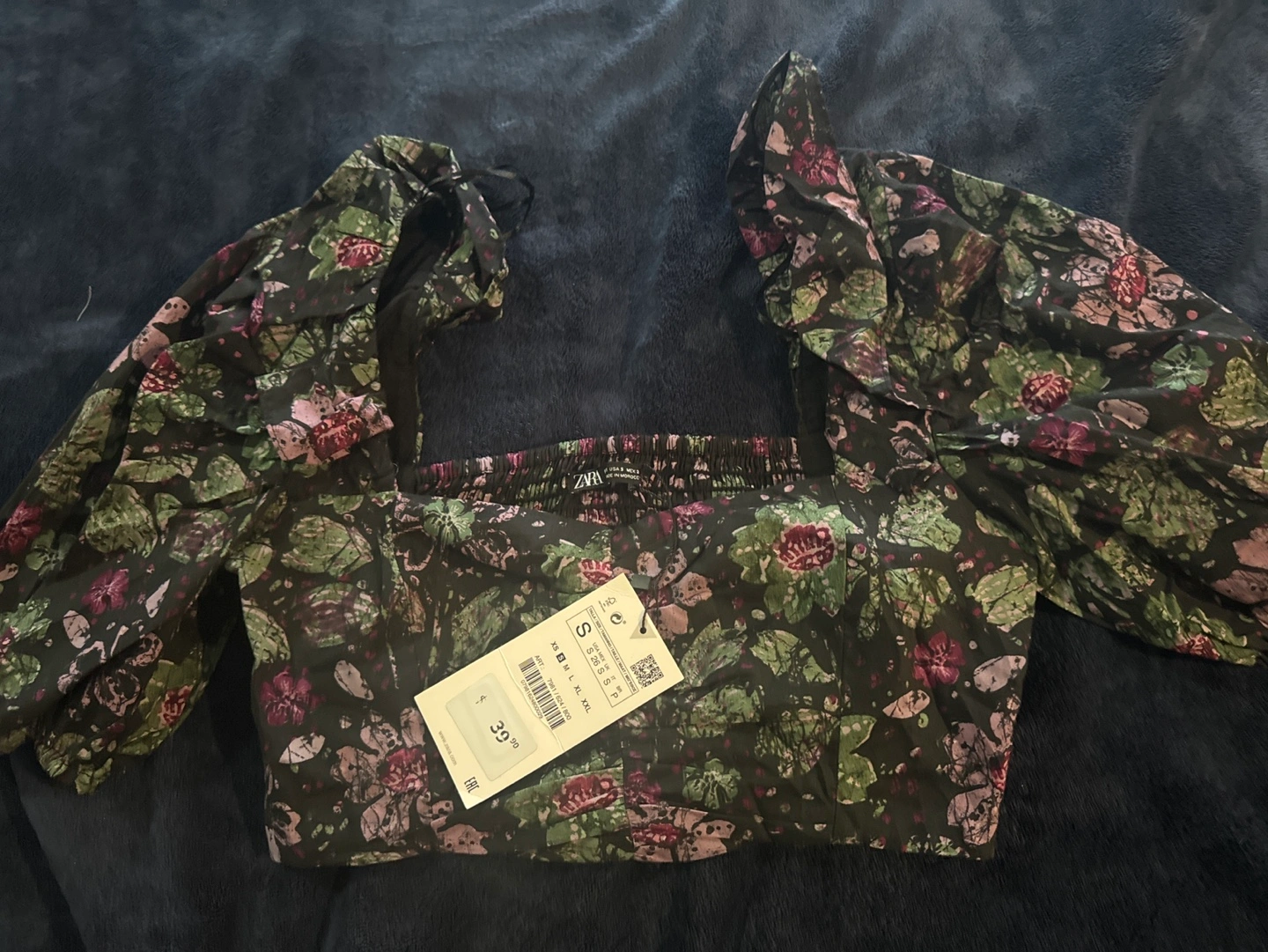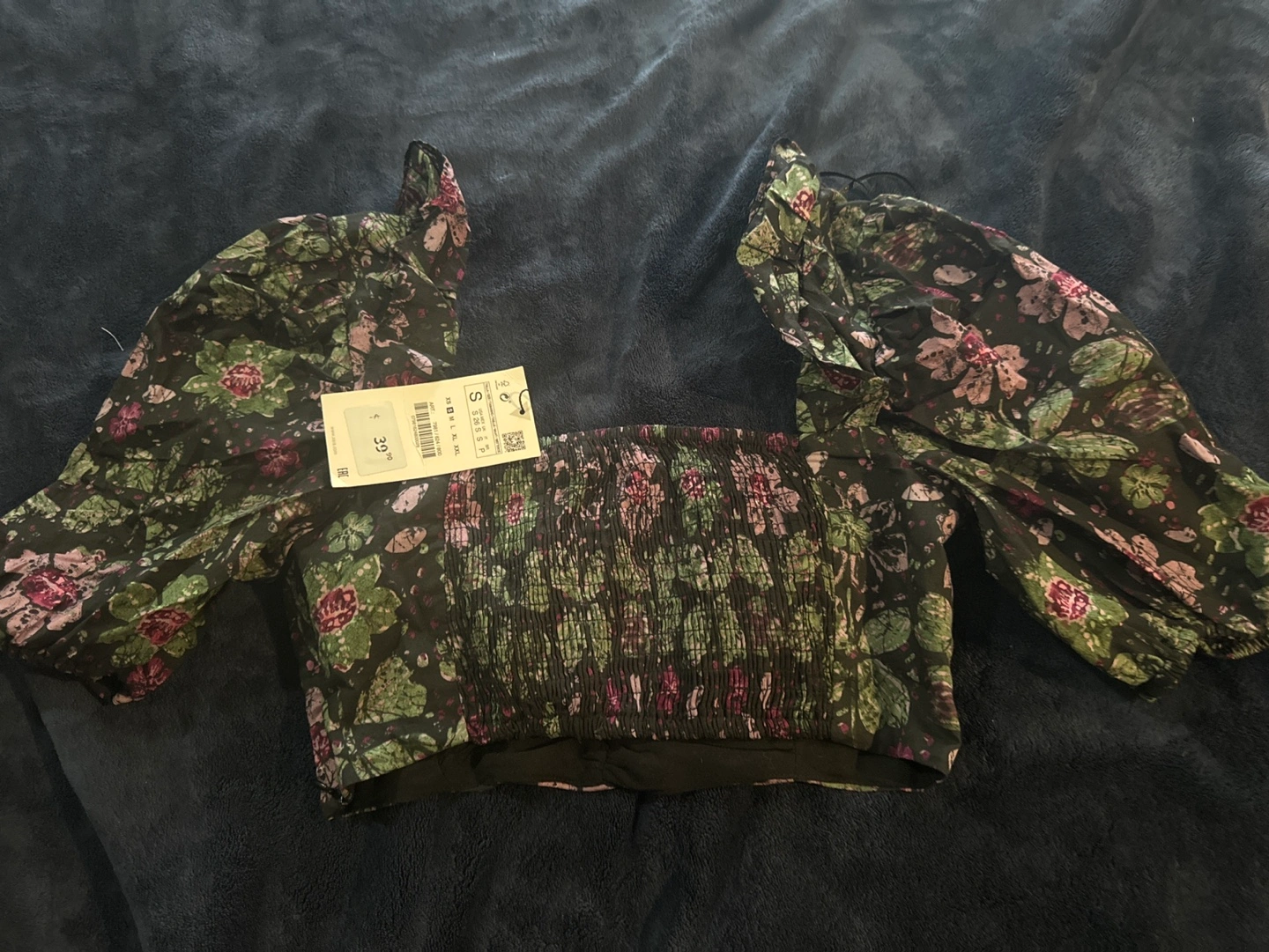 Size small, green floral pattern with purple accents. Puff sleeves with elastic around the wrist. Square neckline. Cash only Pickup only