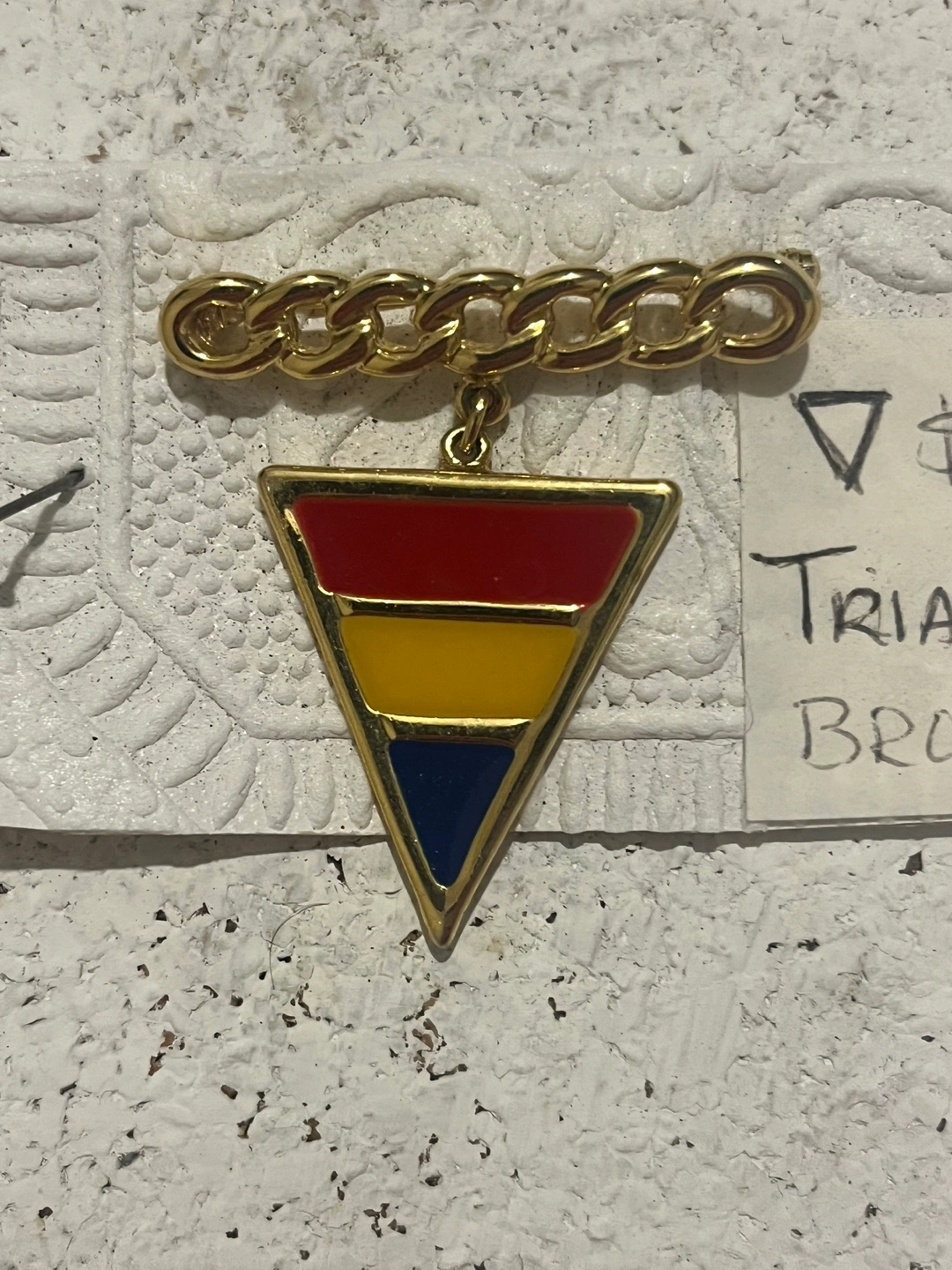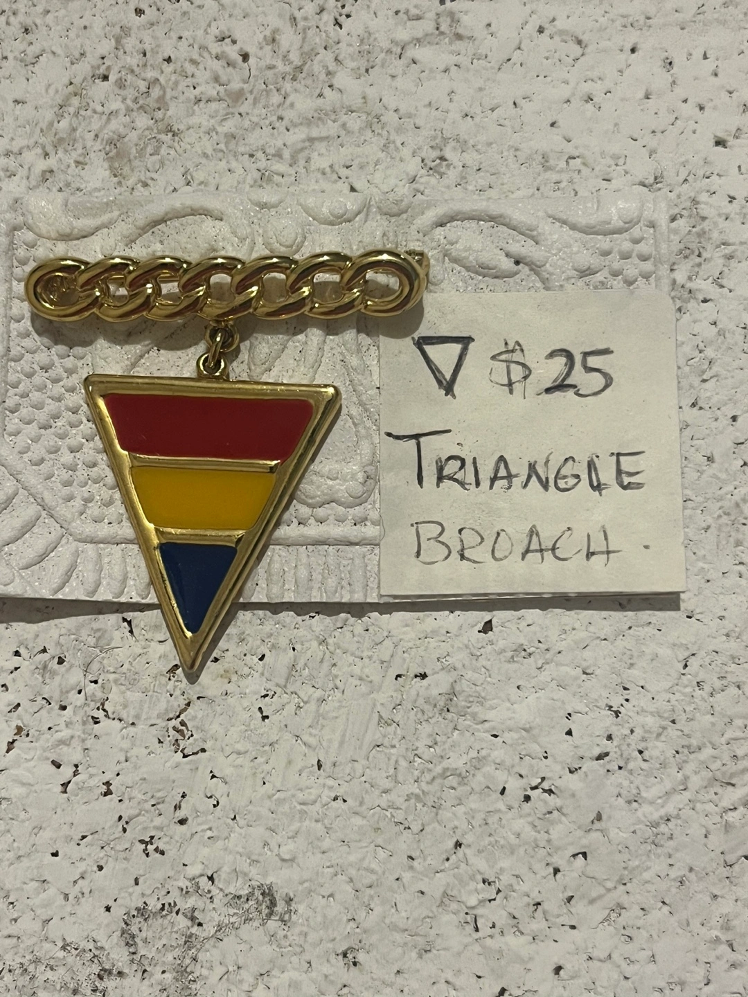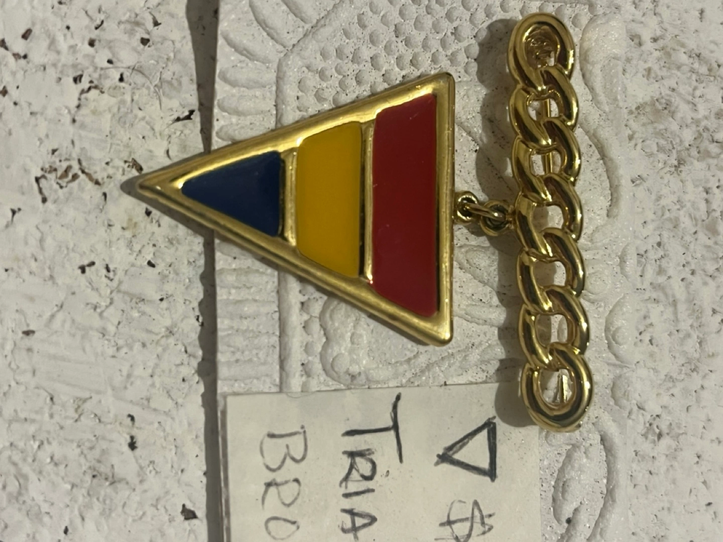 Gold-tone triangle brooch with red, yellow, and blue enamel. Features a chain.
