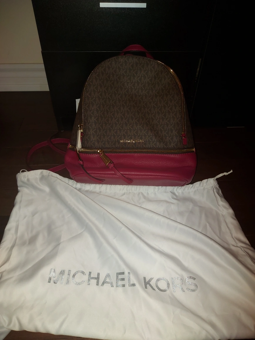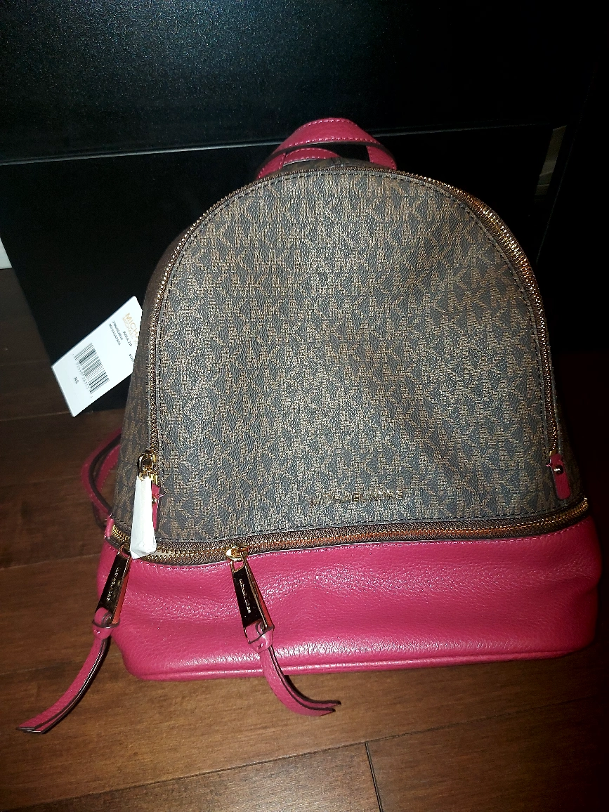 Brown and pink backpack. Has a gold zipper. brand new excellent for christmas gift. tags remain on comes with dust bag. perfect Christmas gift.