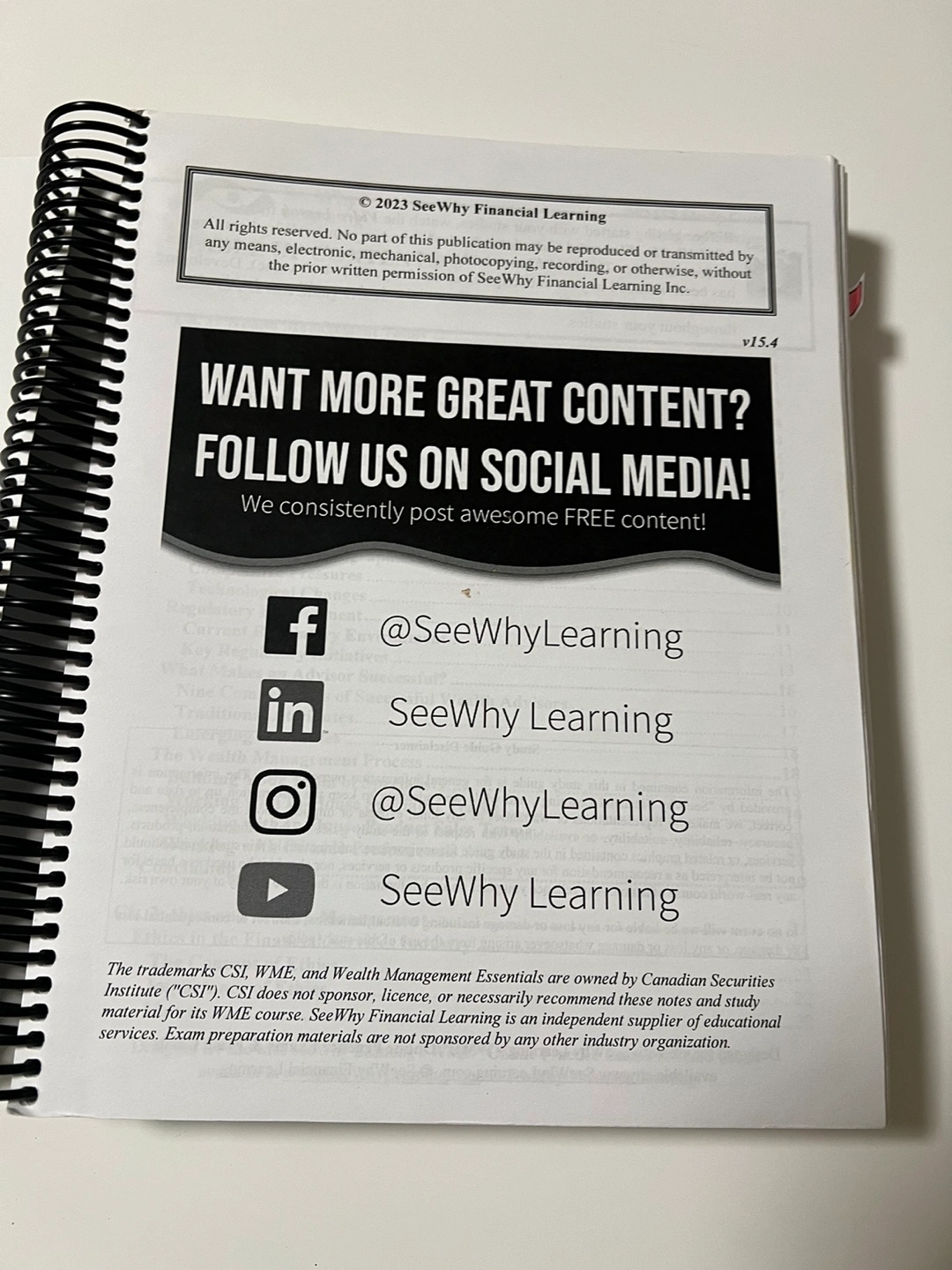 SeeWhy Study guide for the Wealth Management Essentials exam. Spiral bound, July 2023 edition.