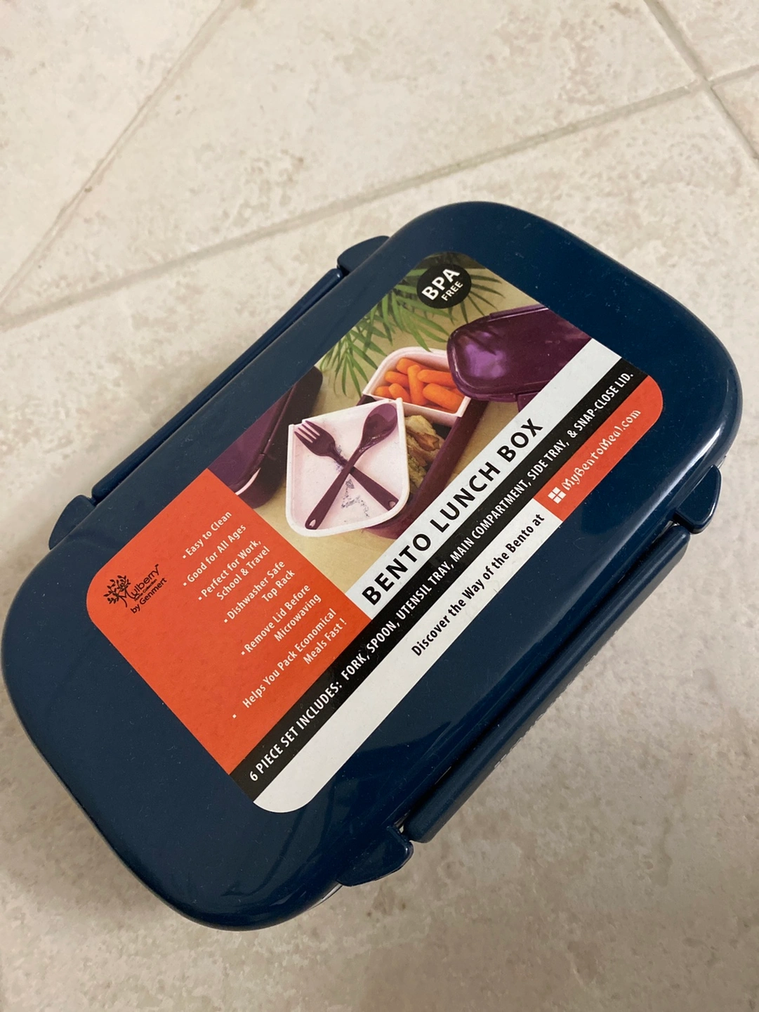 Blue bento lunch box with a removable tray, fork, and spoon. BPA free.