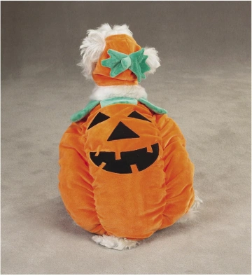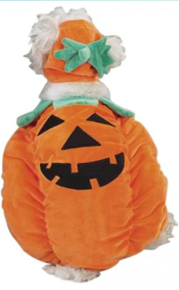Cute pumpkin costume for your dog. Orange with green accents. Includes hat with a green bow. size:small