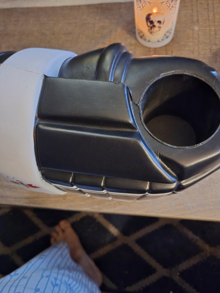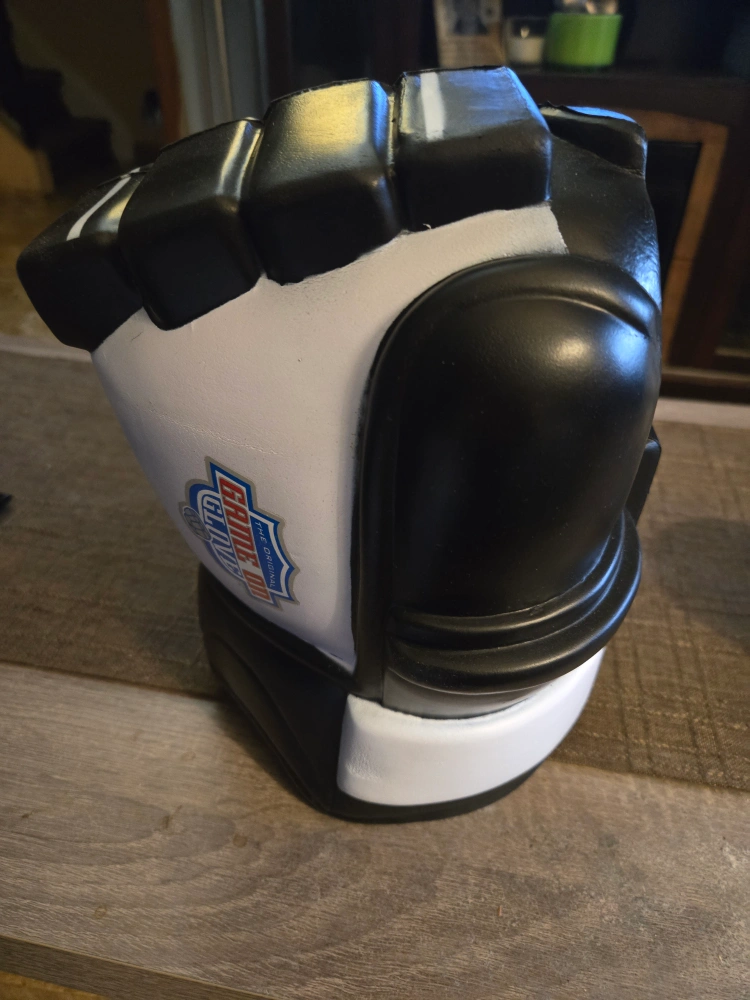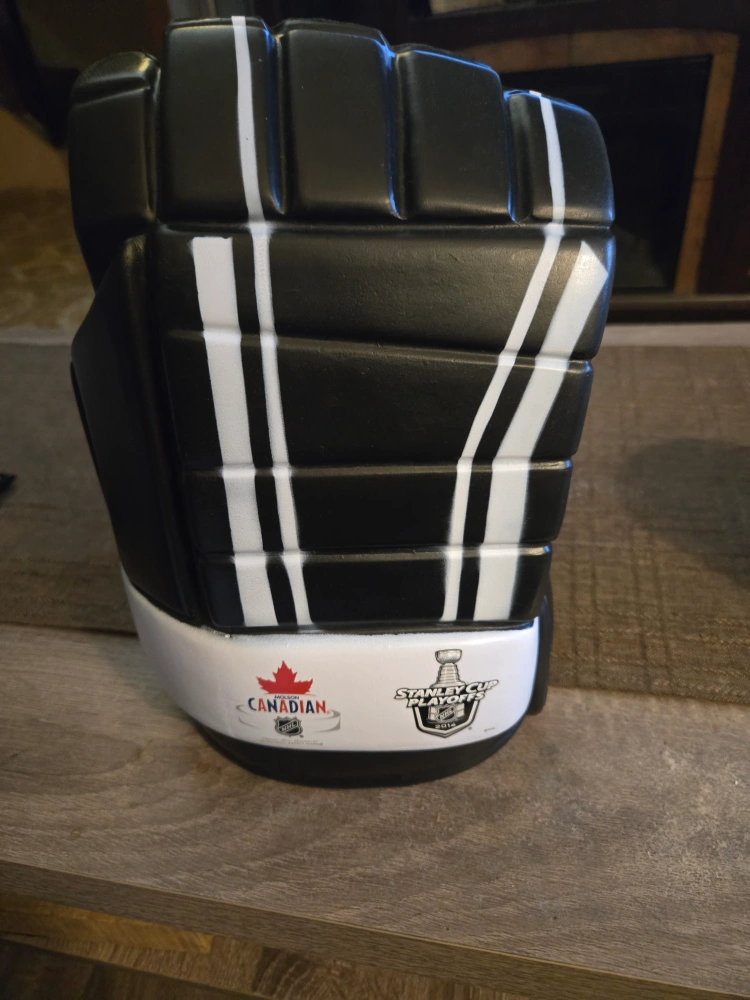Black and white goalie glove Features a Canadian NHL logo and a Stanley Cup logo. i Plastic. pair