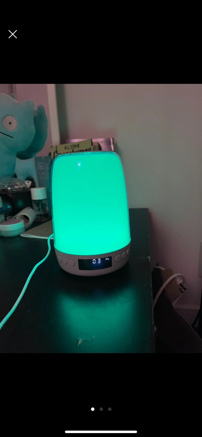 LED Light with Speaker. Includes a clock and the ability to change colours. Requires a power cord to operate.