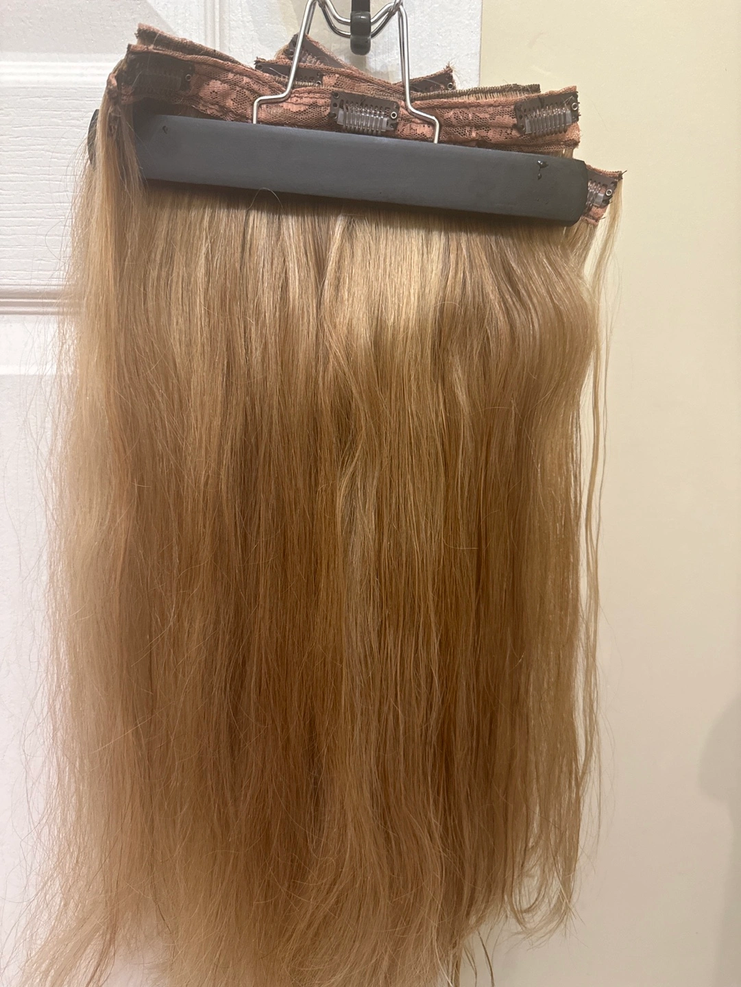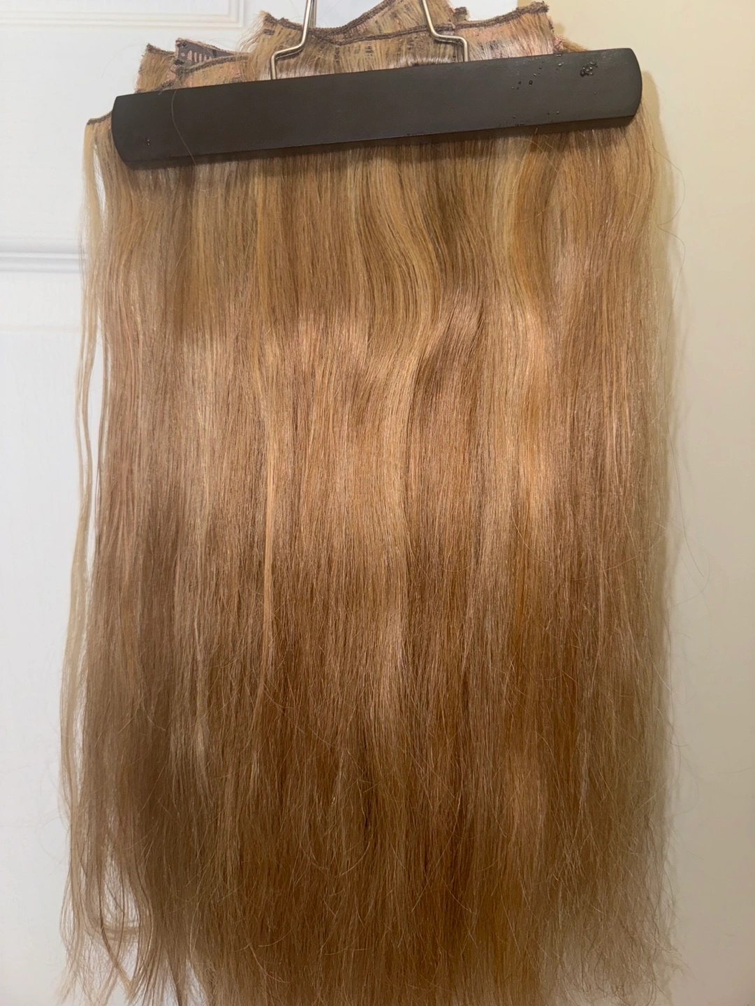 Clip-in hair extensions, long and straight. Light blonde colour. 100% Human Hair Honey brown & Ash blonde Worn twice only & was purchased for 180$