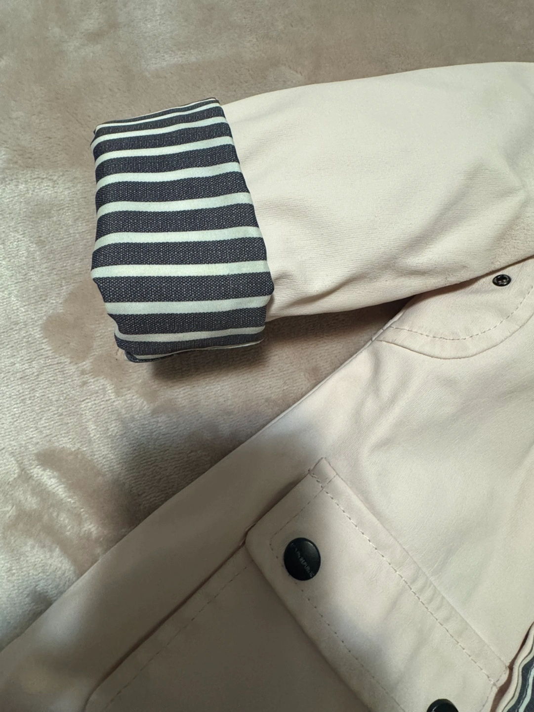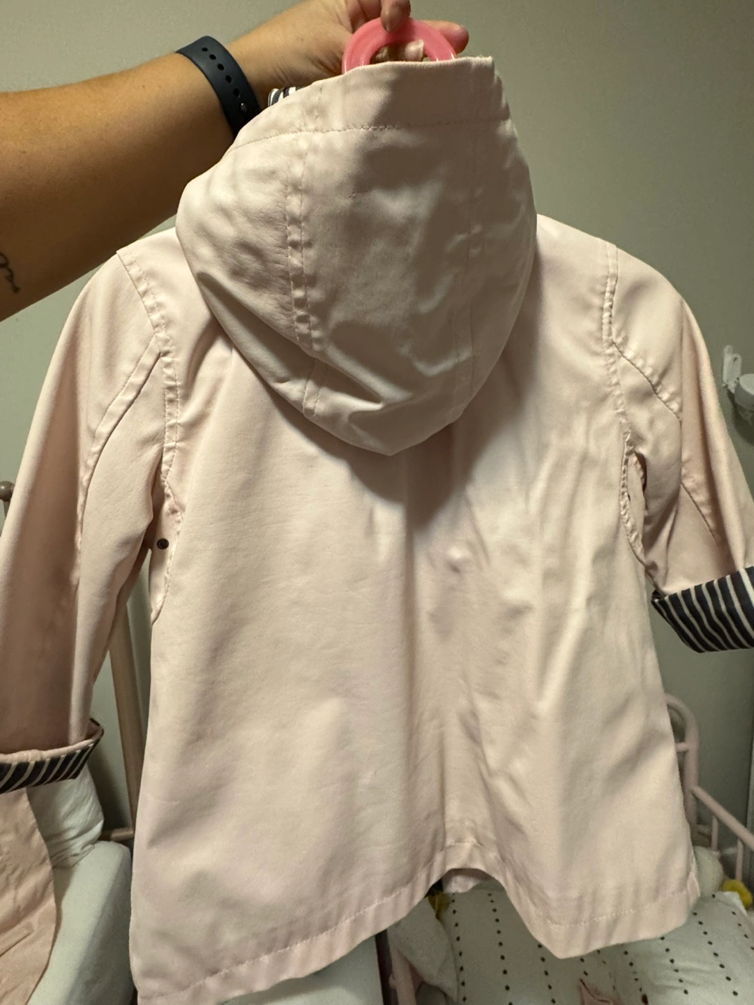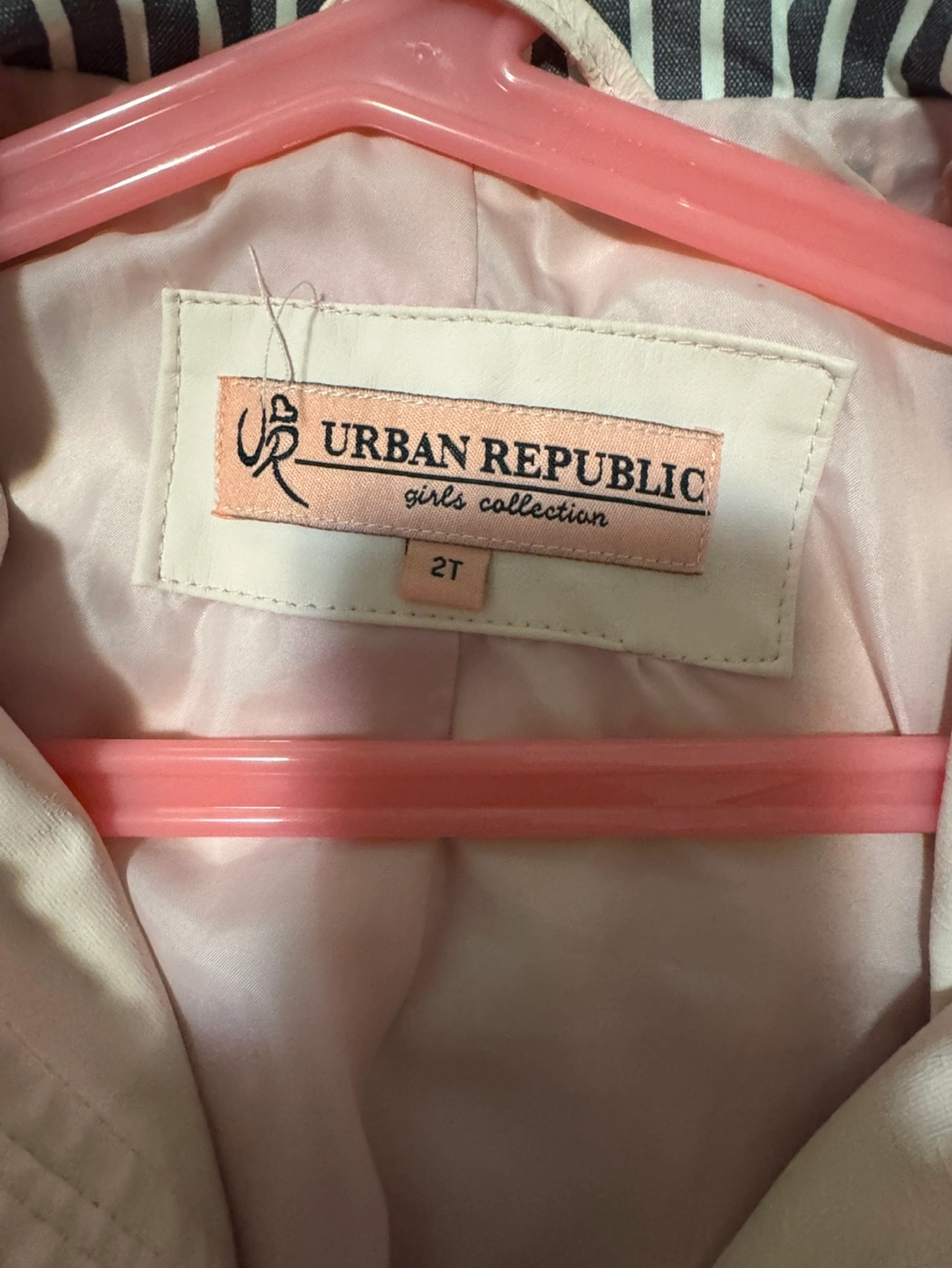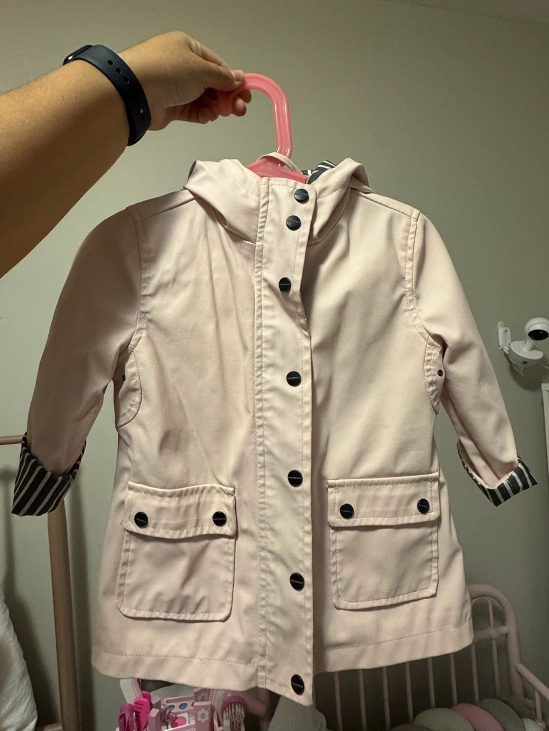 Pink toddler jacket with a hood, zipper closure, and button accents. Features striped fabric on the inside of the collar and sleeves. Pick up Isabella & church Cash only