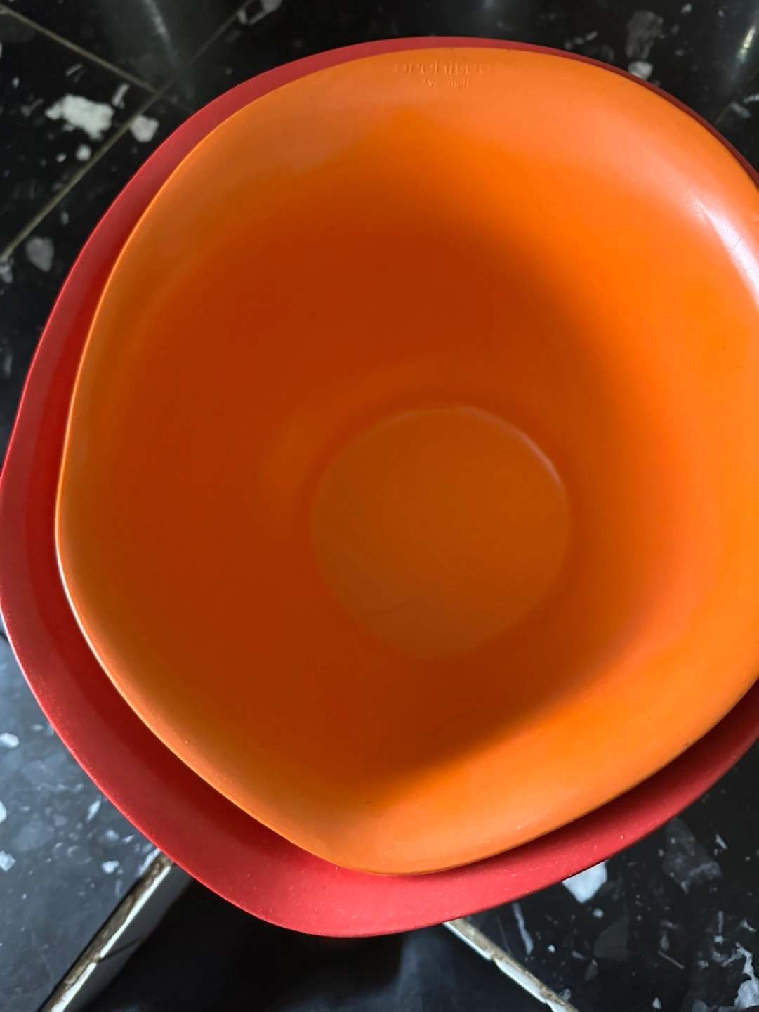 Set of two mixing bowls. One red and one orange. Both are made of durable eco plastic and are dishwasher safe. Not microwave safe. Small damage on bottom of bowls. Smoke free home.