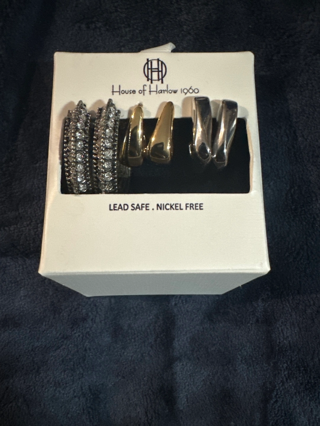 Set of three earrings. One pair of silver hoops with clear stones, one pair of gold hoops, and one pair of silver triangle hoops. Lead safe and nickel free. Cash only Pickup only