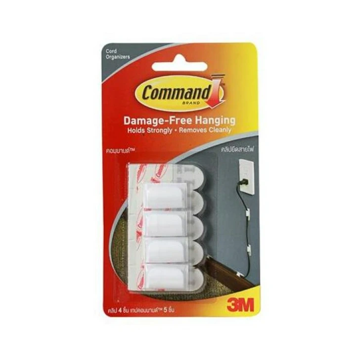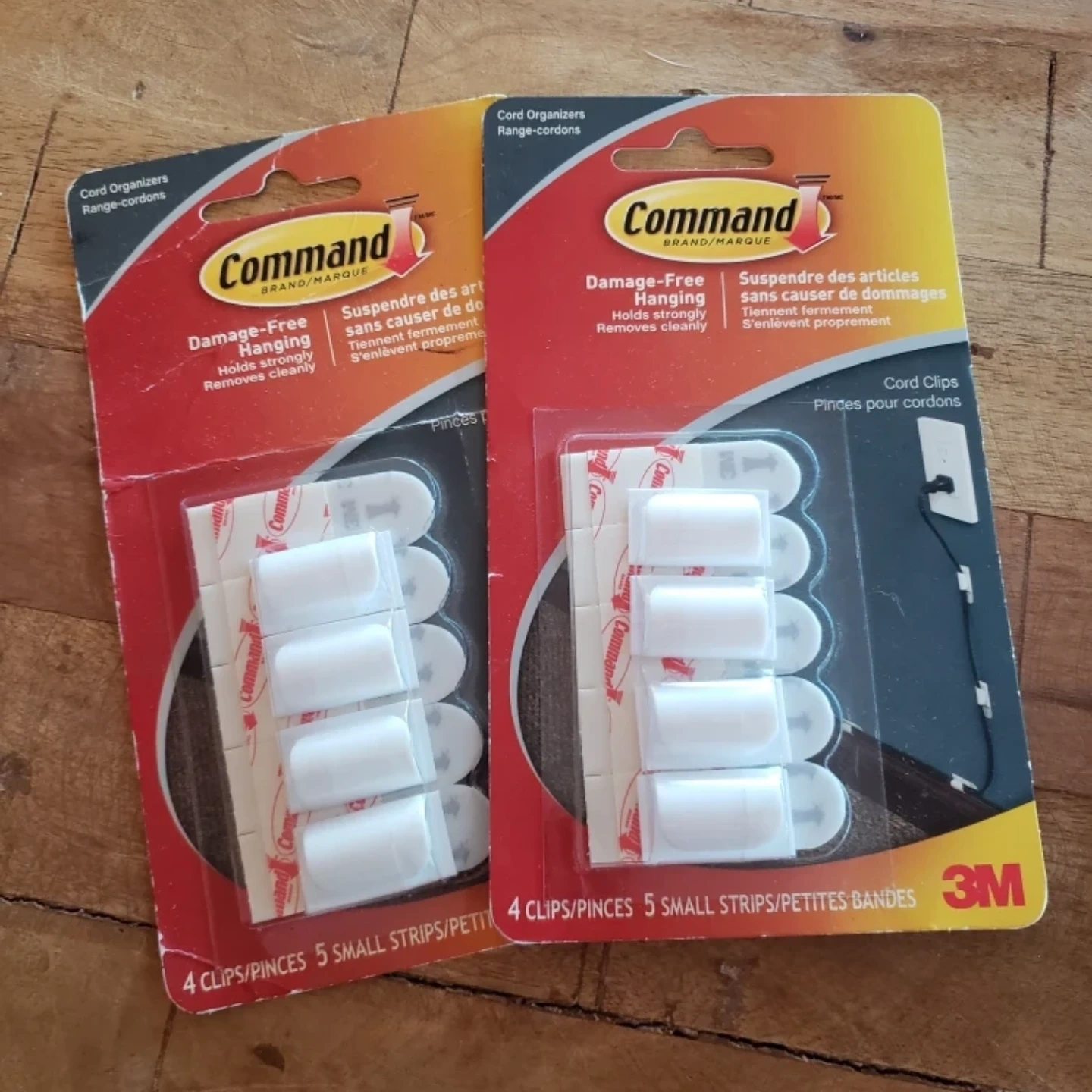 2 packages of Command damage-free hanging cord organizing clips. Holds strongly and removes cleanly. Includes 4 clips and 5 small strips in each pack.