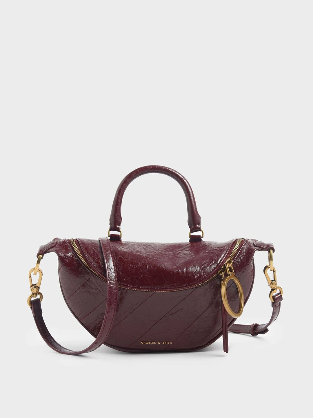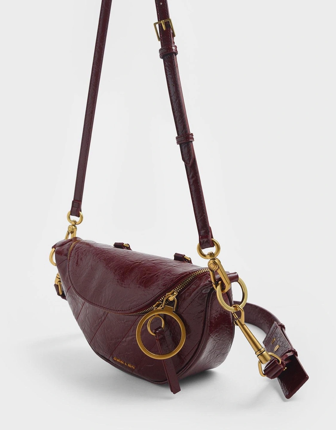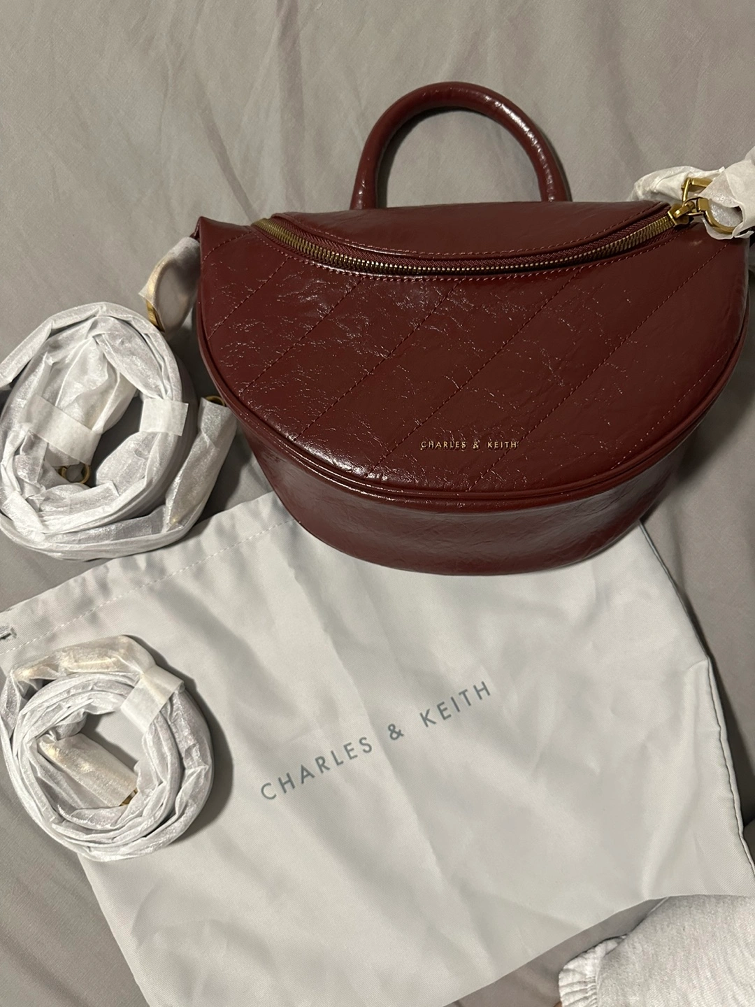 Burgundy leather wrinkled effect crossbody bag. Gold hardware, zipper closure. Includes 2 adjustable straps Comes with a dust bag. Brand new, Never used