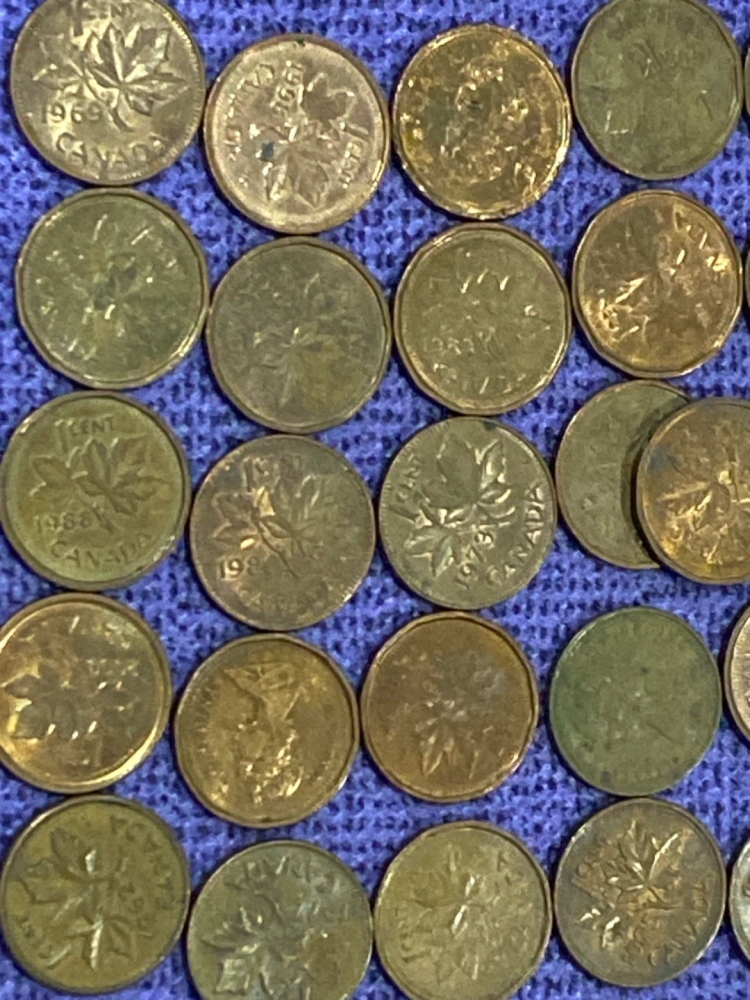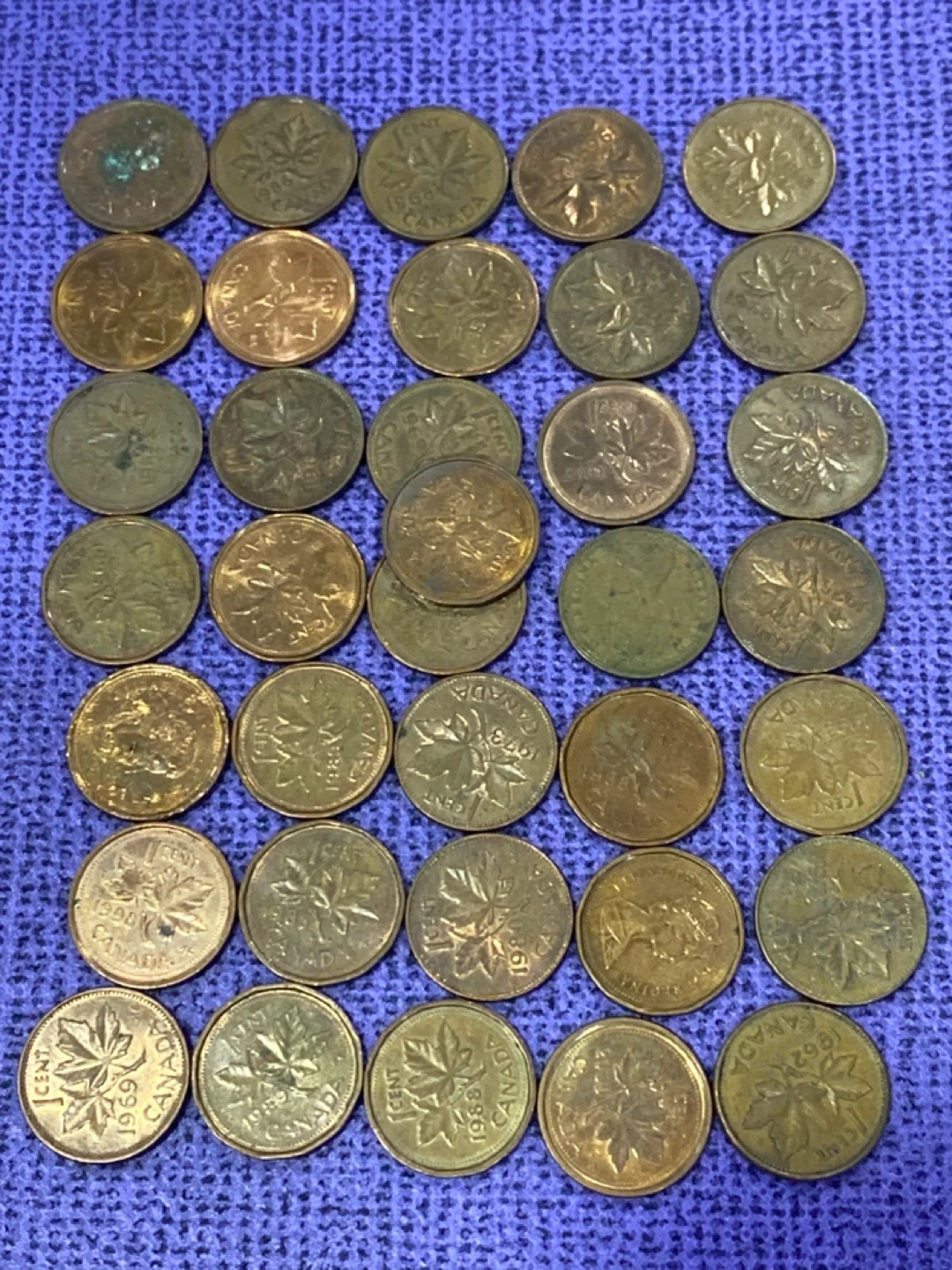 Selling a collection of vintage Canadian pennies! There are 36 pennies in total, each featuring the iconic maple leaf design. The pennies are from various years, including some from the 1960s. A great addition for any coin collector or history buff!