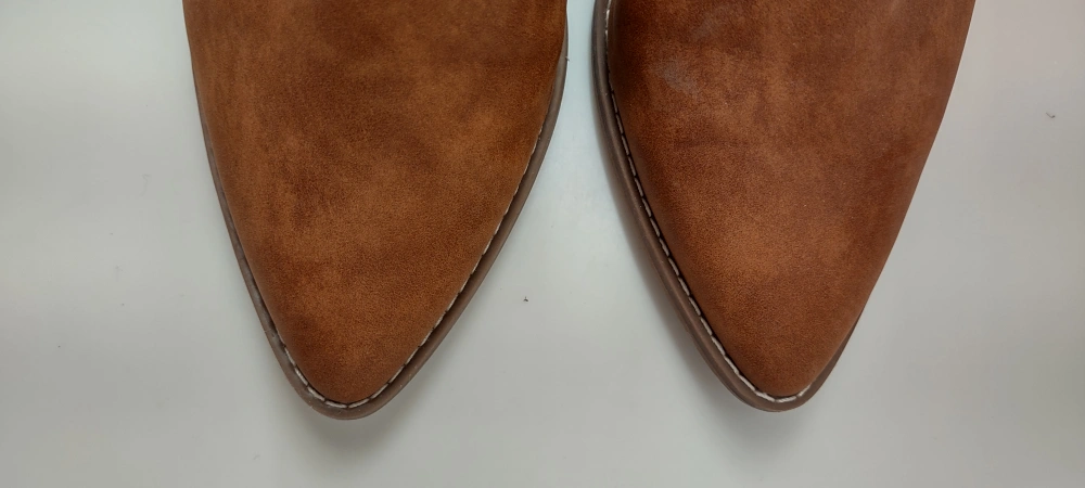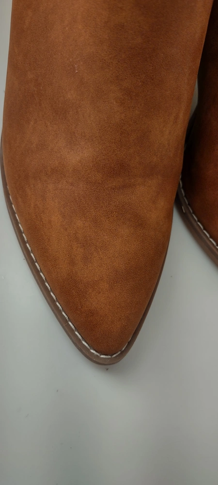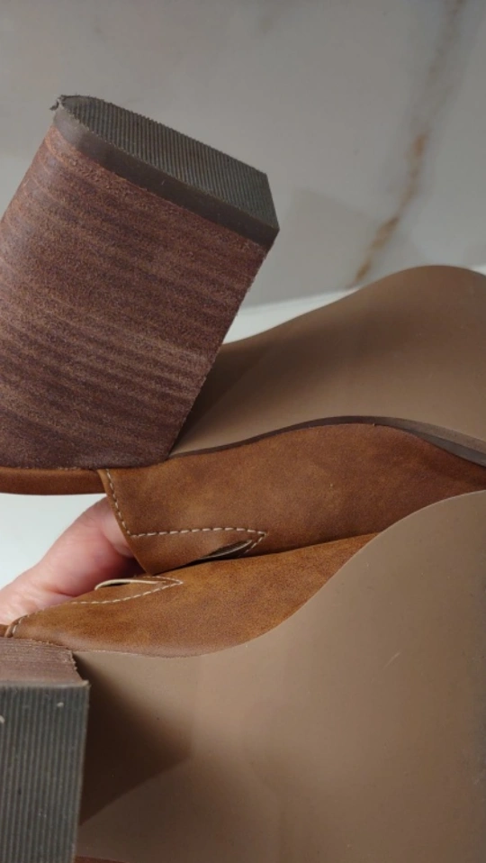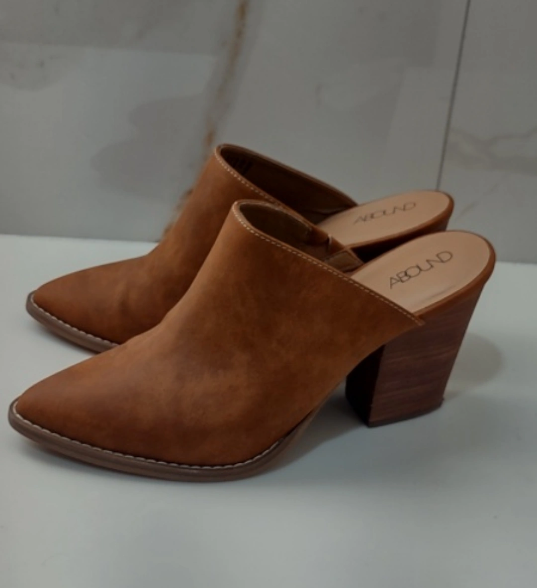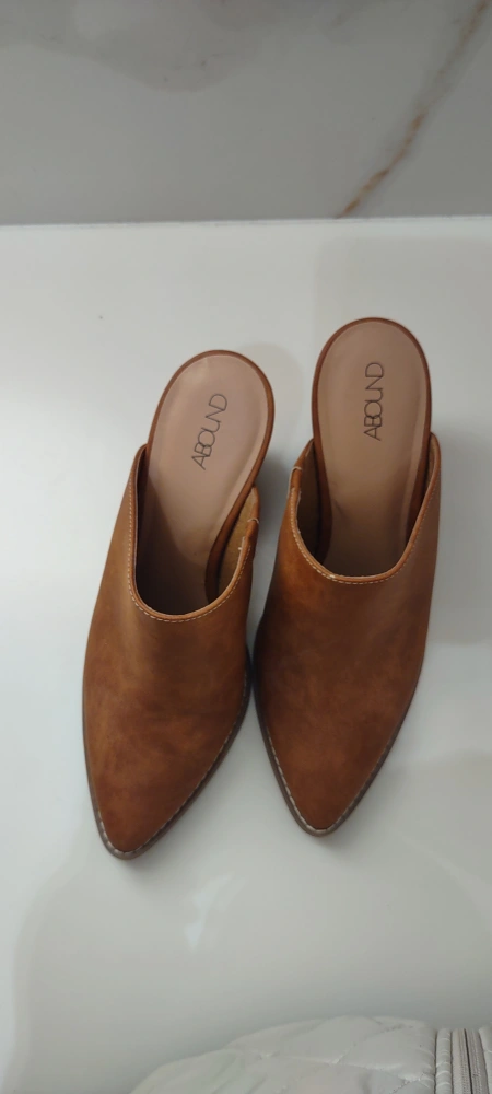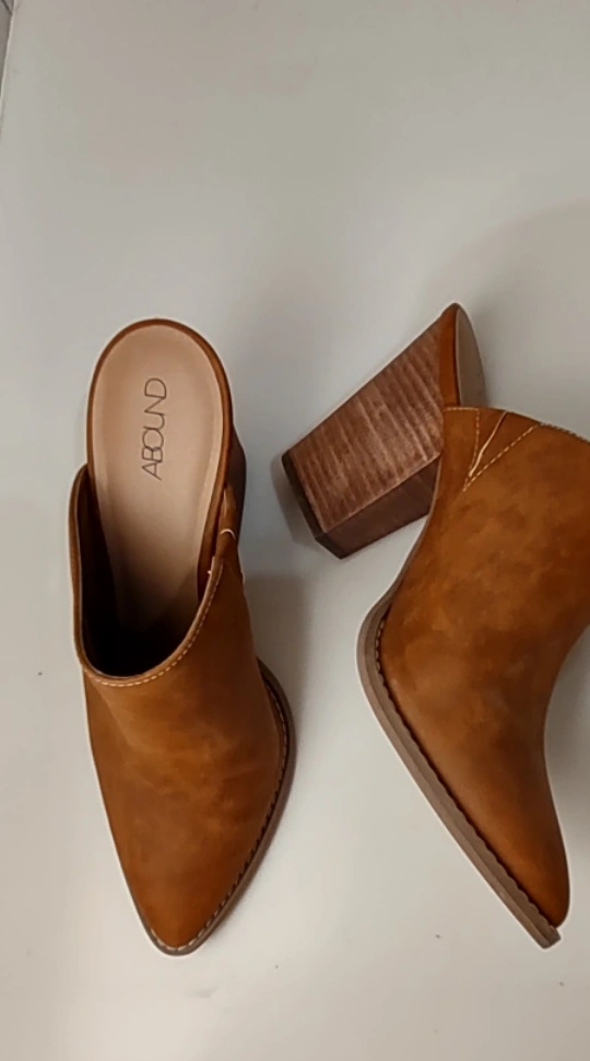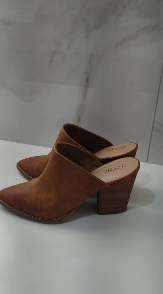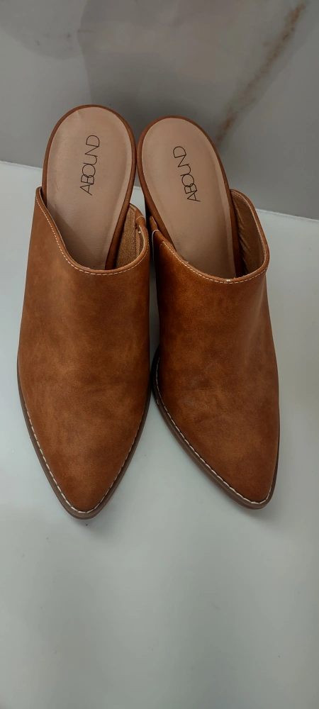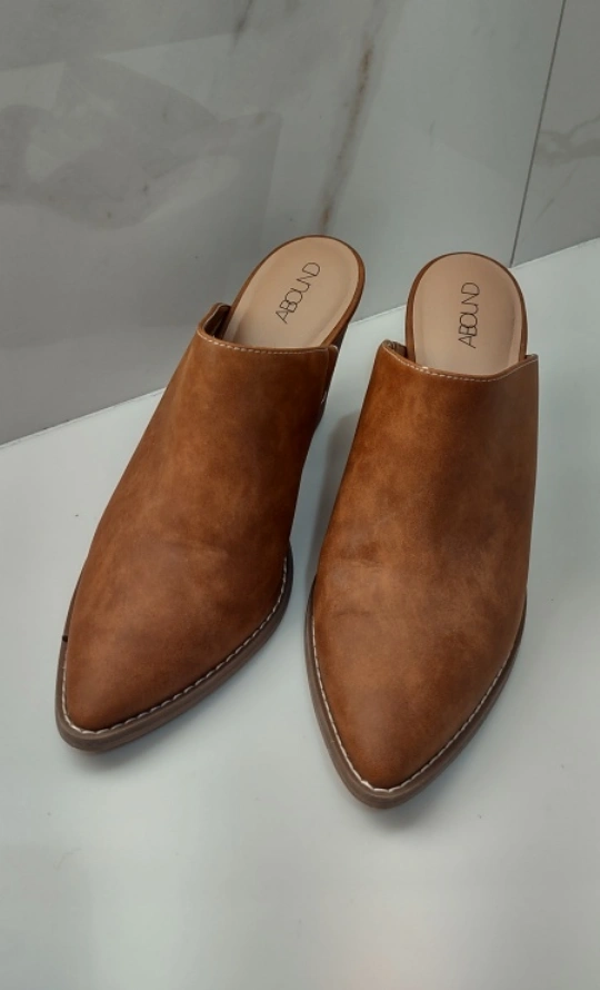 Brown faux leather mules with a pointed toe and block heel. Not really worn out. Bug, smoke, pet free