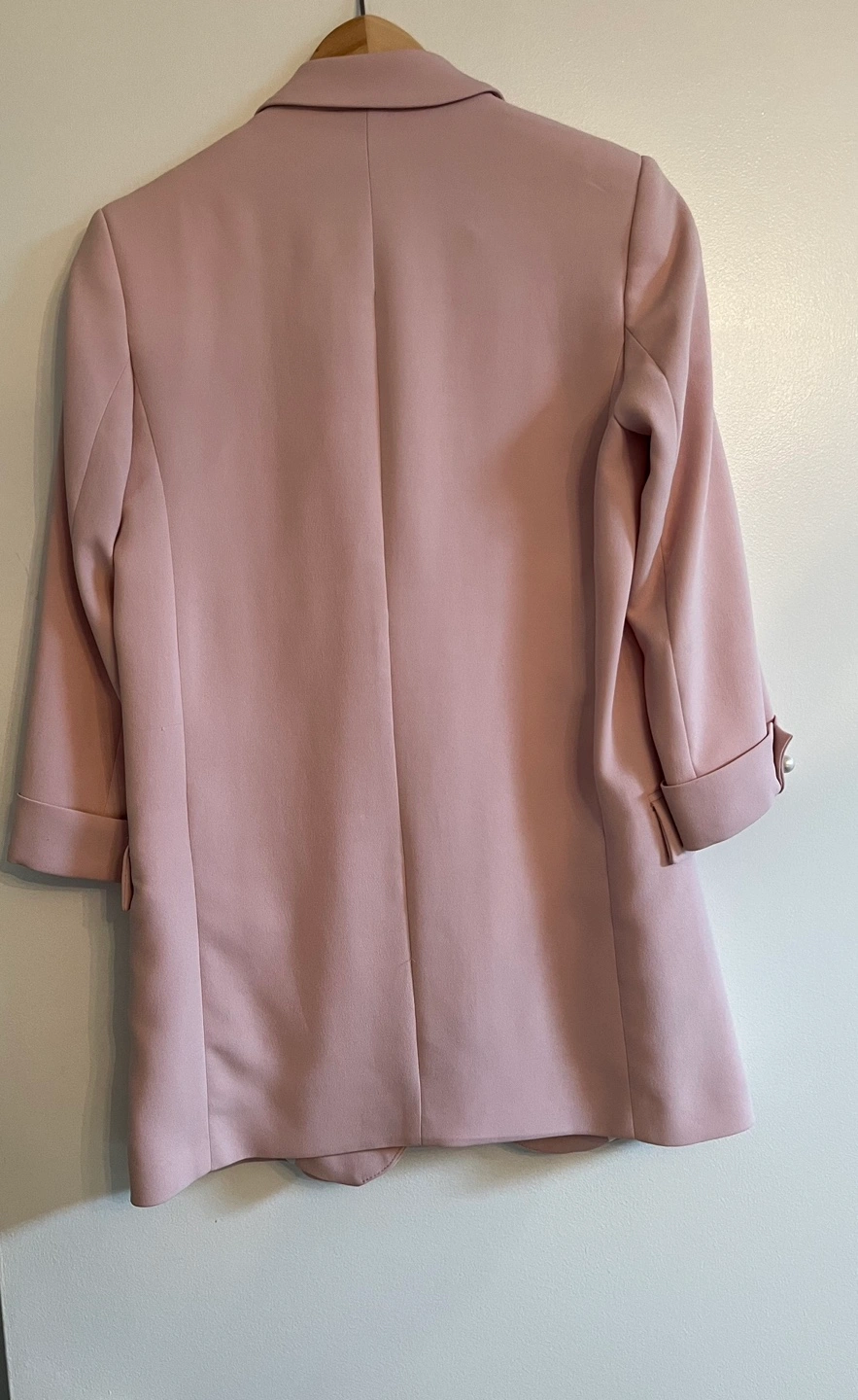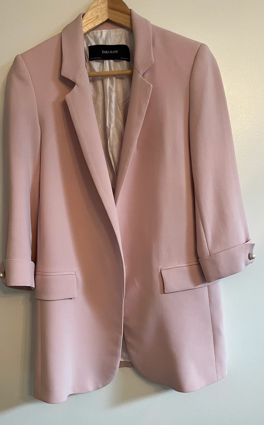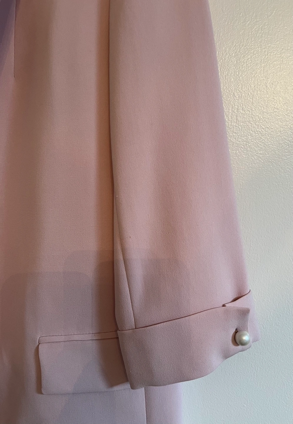 Light pink blazer, three-quarter sleeves, pearl detailing on the cuffs. See photos for tiny fabric pulls due to its soft texture from storage. Price reflects current condition. Gently worn.