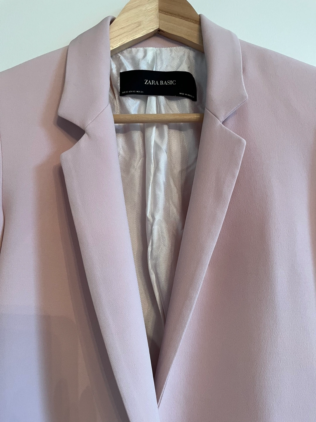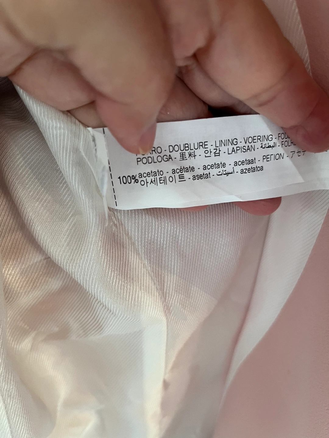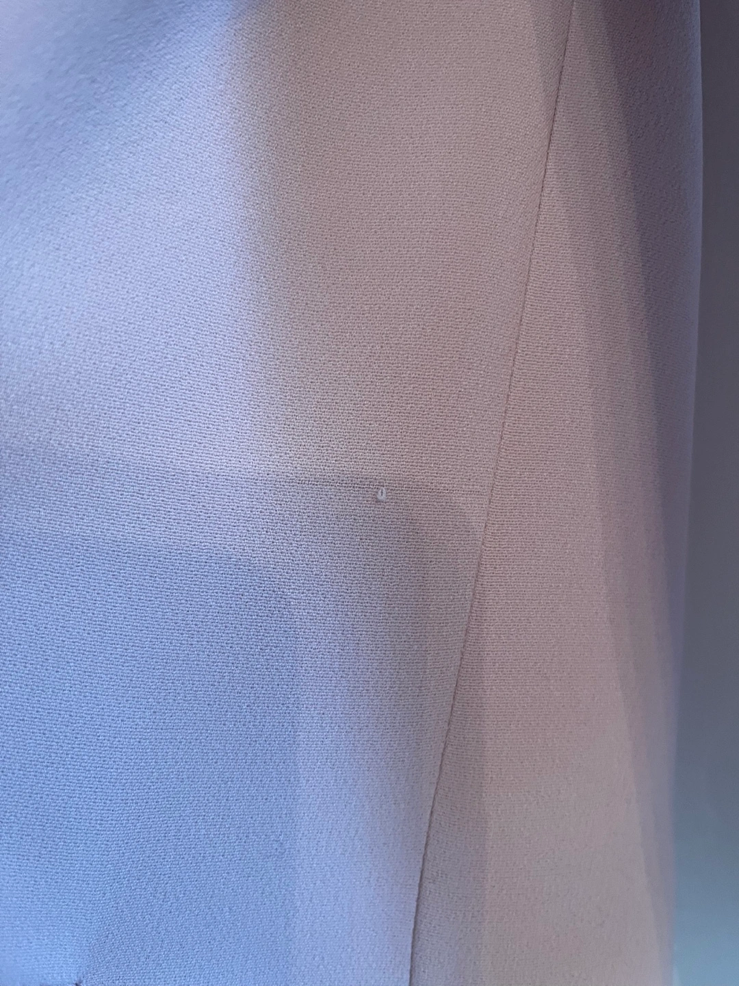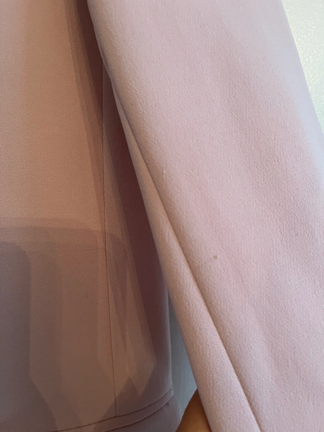 Light pink blazer, three-quarter sleeves, pearl detailing on the cuffs. See photos for tiny fabric pulls due to its soft texture from storage. Price reflects current condition. Gently worn.