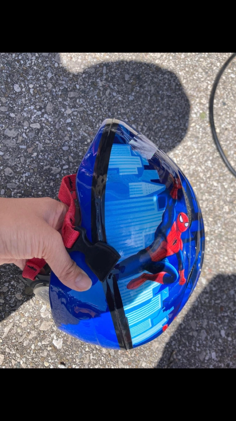 Blue and red Spiderman helmet. Features a graphic of Spiderman swinging from a building. SFPF home. Porch pick up near Dufferin and Centre, Thornhill.