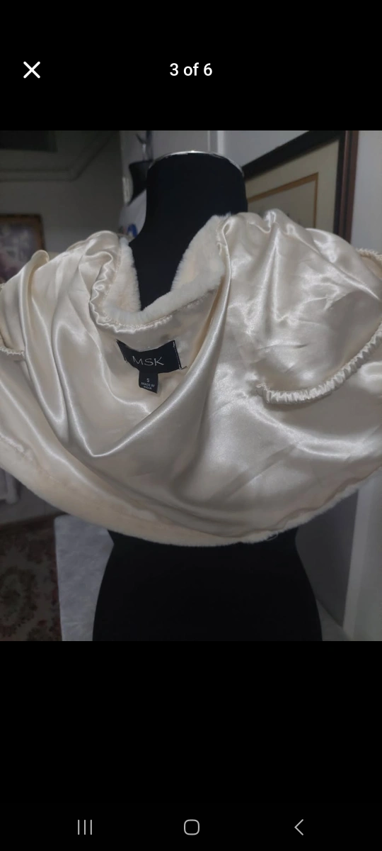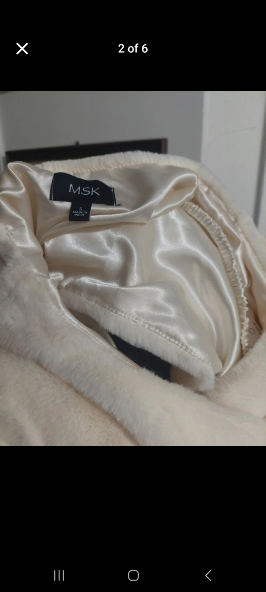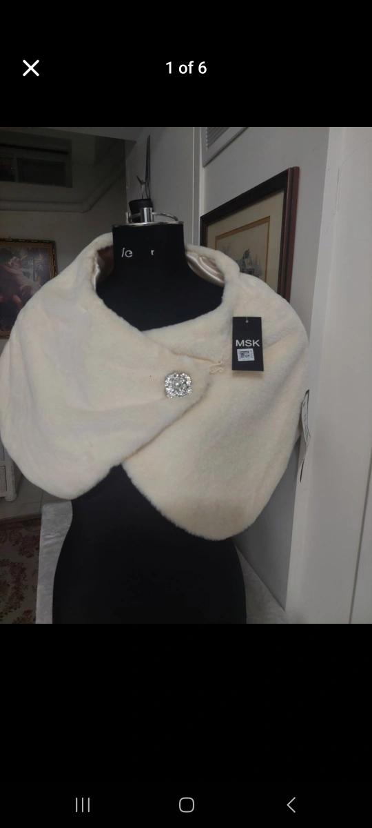 This piece is what you would like to wear at the office Christmas party or to stand out at your friend' wedding. Wear it on family picture day or on your birthday! White faux fur wrap. Has a satin lining. Comes with a decorative brooch.White faux fur bolero jacjet. Has a rhinestone brooch. Size S. Made in India. Upgrade your wardrobe to feel rich and stylish for the holidays. This elegant piece is perfect for weddings, birthdays, cruise Christmas, or any fancy occasion.